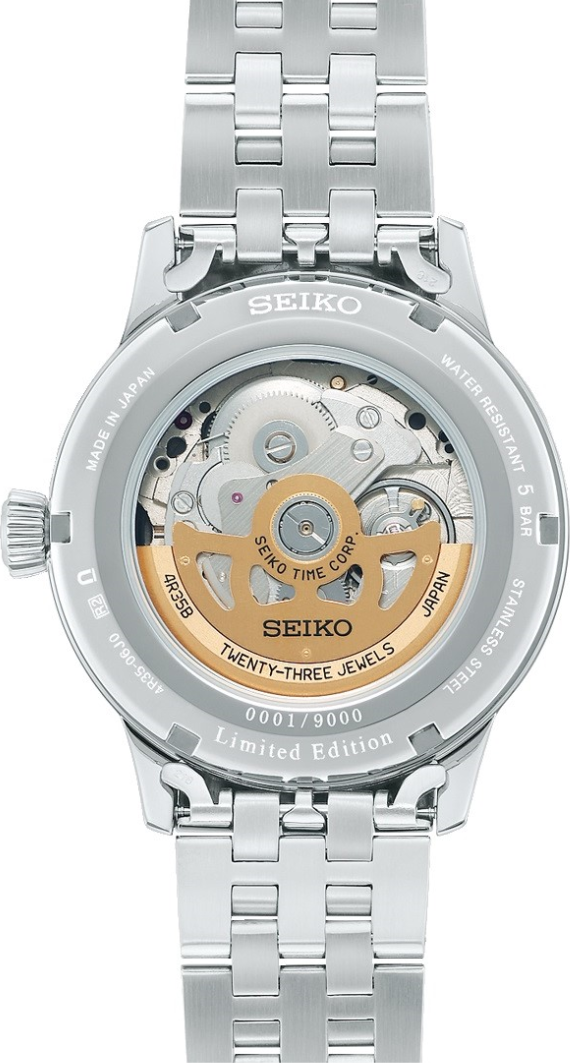• Funkce a popis:Čas, datum, strojek vlastní výroby (in-house) automatic Japan Seiko Caliber 4R35 (23 kamenových uložení), rezerva chodu 41 hodin, polokmity setrvačky 21.600/h = přesnost chodu 4 - 7 vteřin denně, vlásek setrvačky - Seiko Spron 510 (odolný vůči otřesům a běžnému magnetickému poli pro stabilní přesnost chodu), materiál hnací pružiny (pera) - Seiko Spron 510 (pero je antimagnetické a po celou dobu své životnosti zachovává stejnou tvrdost a pružnost, což je důležité pro trvalou a konstantní přesnost chodu strojku), hodinky jsou odolné magnetismu o síle 4.800 A/M (60 Gaussům = 5 cm, pro představu - mobilní telefon vzdálen od hodinek 5 cm zasahuje hodinky magnetickým polem o síle 400 A/M a přiblížíme-li hodinky na dotek k telefonu, hodinky zasáhne magnetické pole silou až 16.000 A/M), automatický nátah (hodinky se natahují pohybem ruky) + ruční nátah (hodinky lze natáhnout/dotáhnout i ručně korunkou, hodinky disponují funkcí strojku "Hacking" (při vytažení korunky do nejzažší polohy pro řízení ručiček se zastavuje vteřinová ručička), hodinky splňují normu antimagnetičnosti ISO 764