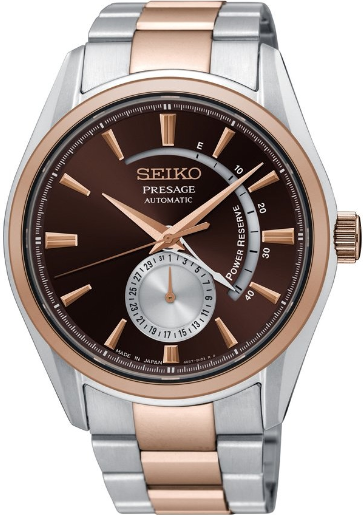• Funkce a popis:Čas, datum, ukazatel rezervy chodu, strojek vlastní výroby (in-house) automatic Japan Seiko Caliber 4R57 (29 kamenových uložení), rezerva chodu 41 hodin, polokmity setrvačky 21.600/h = přesnost chodu 3 - 6 vteřiny denně, vlásek setrvačky - Seiko Spron 510 (odolný vůči otřesům a běžnému magnetickému poli pro stabilní přesnost chodu), hodinky jsou odolné magnetismu o síle 4.800 A/M (60 Gaussům = 5 cm, pro představu - mobilní telefon vzdálen od hodinek 5 cm zasahuje hodinky magnetickým polem o síle 400 A/M a přiblížíme-li hodinky na dotek k telefonu, hodinky zasáhne magnetické pole silou až 16.000 A/M), automatický nátah (hodinky se natahují pohybem ruky) + ruční nátah (hodinky lze natáhnout/dotáhnout i ručně korunkou, rotor samonátahu má oboustranný nátah, regulace přesnosti - ETACHRON (minimální vůle vlásku v zámečku regulační ručky zajišťuje vysokou přesnost hodinek), nárazuvzdor setrvačky Diashock (hodinky jsou částečně odolné vůči nárazu či pádu), hodinky disponují funkcí strojku "Hacking" (při vytažení korunky do nejzažší polohy pro řízení ručiček se zastavuje vteřinová ručička)