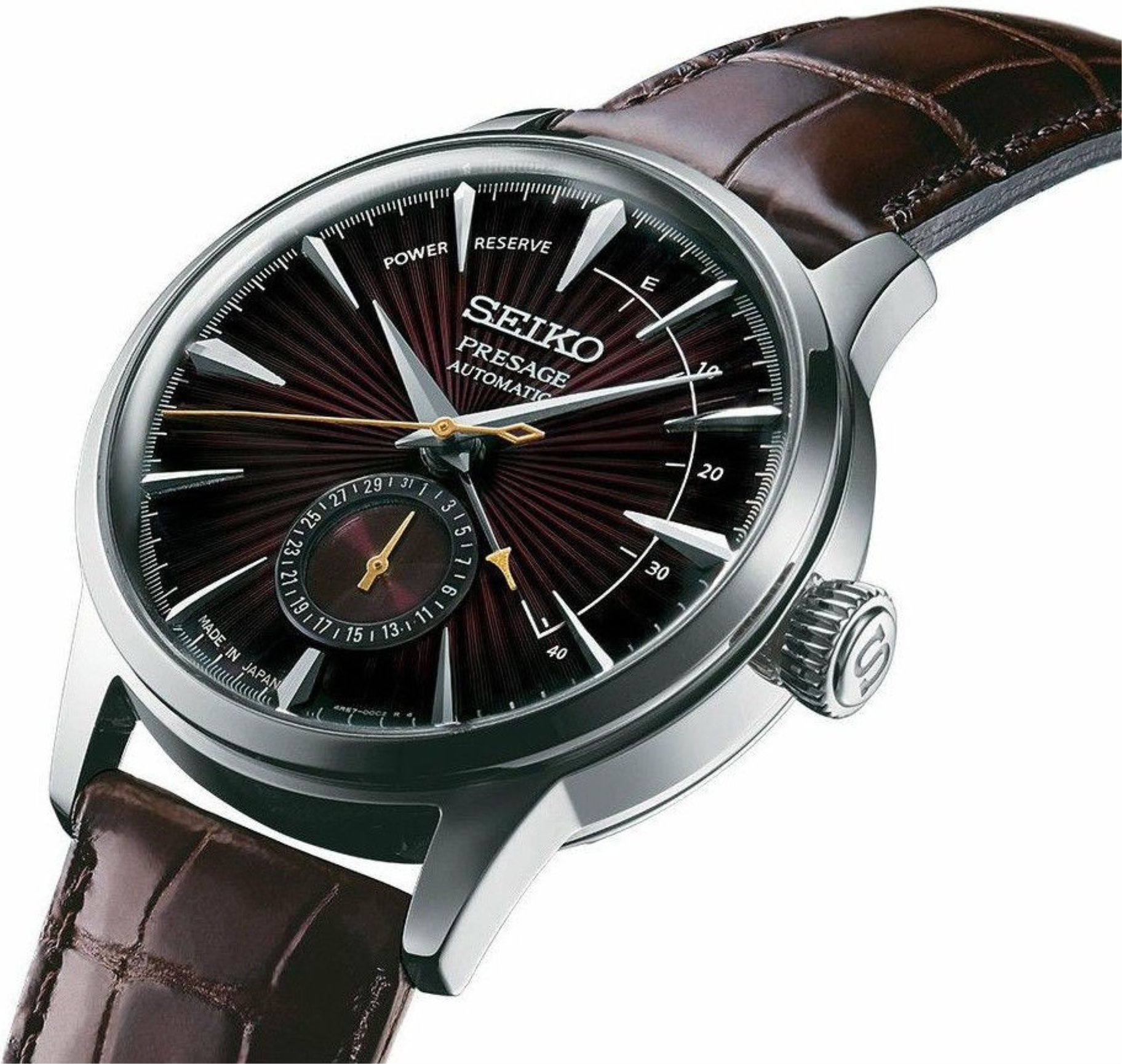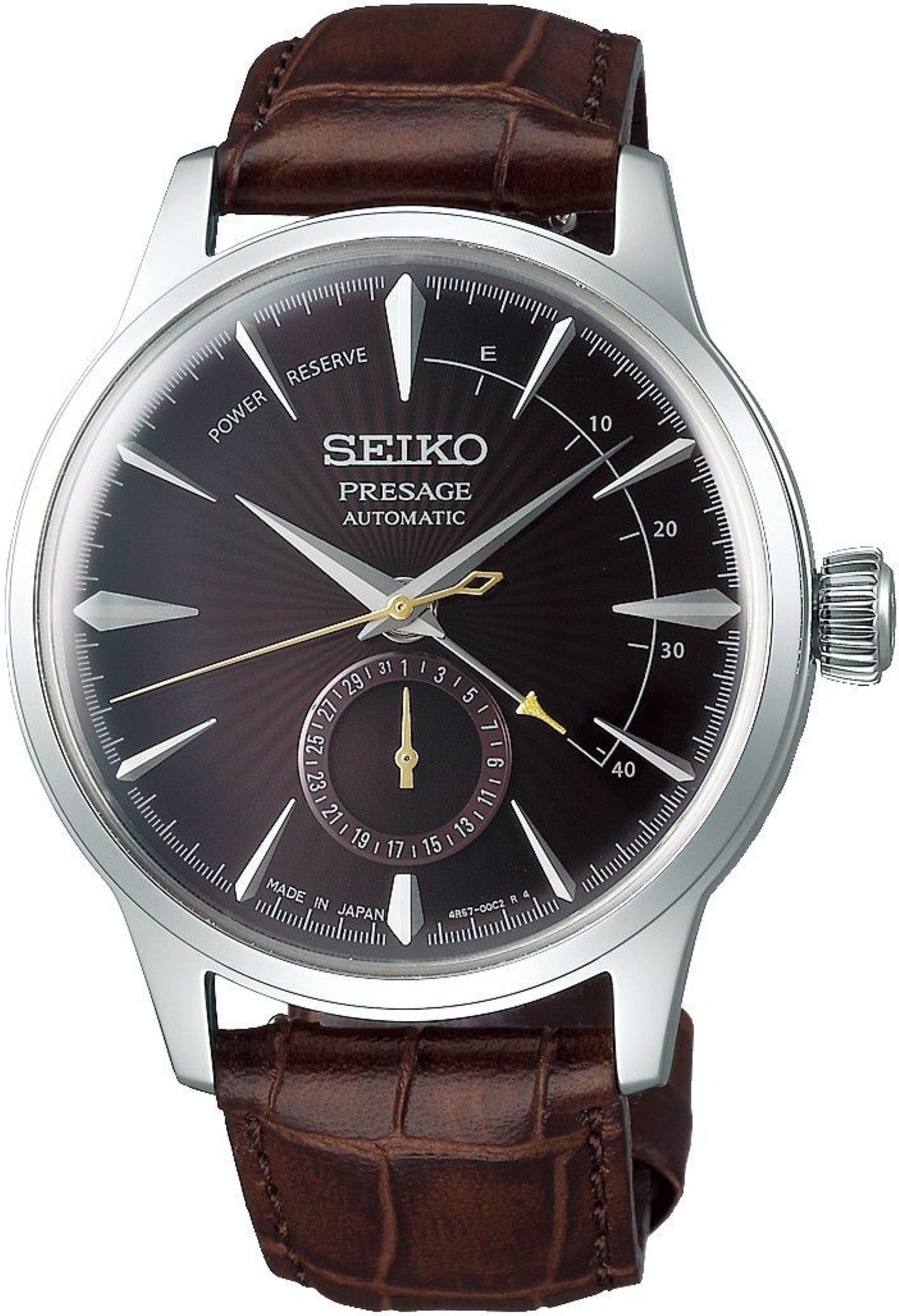 • Funkce a popis:Čas, datum, strojek vlastní výroby (in-house) automatic Japan Seiko Caliber 4R57 (29 kamenových uložení), rezerva chodu 41 hodin, zobrazení rezervy chodu centrální ručičkou, vnořený číselník pro excentrickou vteřinovou ručičku, polokmity setrvačky 21.600/h = přesnost chodu 4 - 7 vteřin denně, průhledné zadní víčko pro náhled na strojek, vlásek setrvačky - Seiko Spron 510 (odolný vůči otřesům a běžnému magnetickému poli pro stabilní přesnost chodu), hodinky jsou odolné magnetismu o síle 4.800 A/M (60 Gaussům = 5 cm, pro představu - mobilní telefon vzdálen od hodinek 5 cm zasahuje hodinky magnetickým polem o síle 400 A/M a přiblížíme-li hodinky na dotek k telefonu, hodinky zasáhne magnetické pole silou až 16.000 A/M), automatický nátah (hodinky se natahují pohybem ruky) + ruční nátah (hodinky lze natáhnout/dotáhnout i ručně korunkou, rotor samonátahu má oboustranný nátah, regulace přesnosti - ETACHRON (minimální vůle vlásku v zámečku regulační ručky zajišťuje vysokou přesnost hodinek), nárazuvzdor setrvačky Diashock (hodinky jsou částečně odolné vůči nárazu či pádu), hodinky disponují funkcí strojku "Hacking" (při vytažení korunky do nejzažší polohy pro řízení ručiček se zastavuje vteřinová ručička), hodinky splňují normu antimagnetičnosti ISO 764