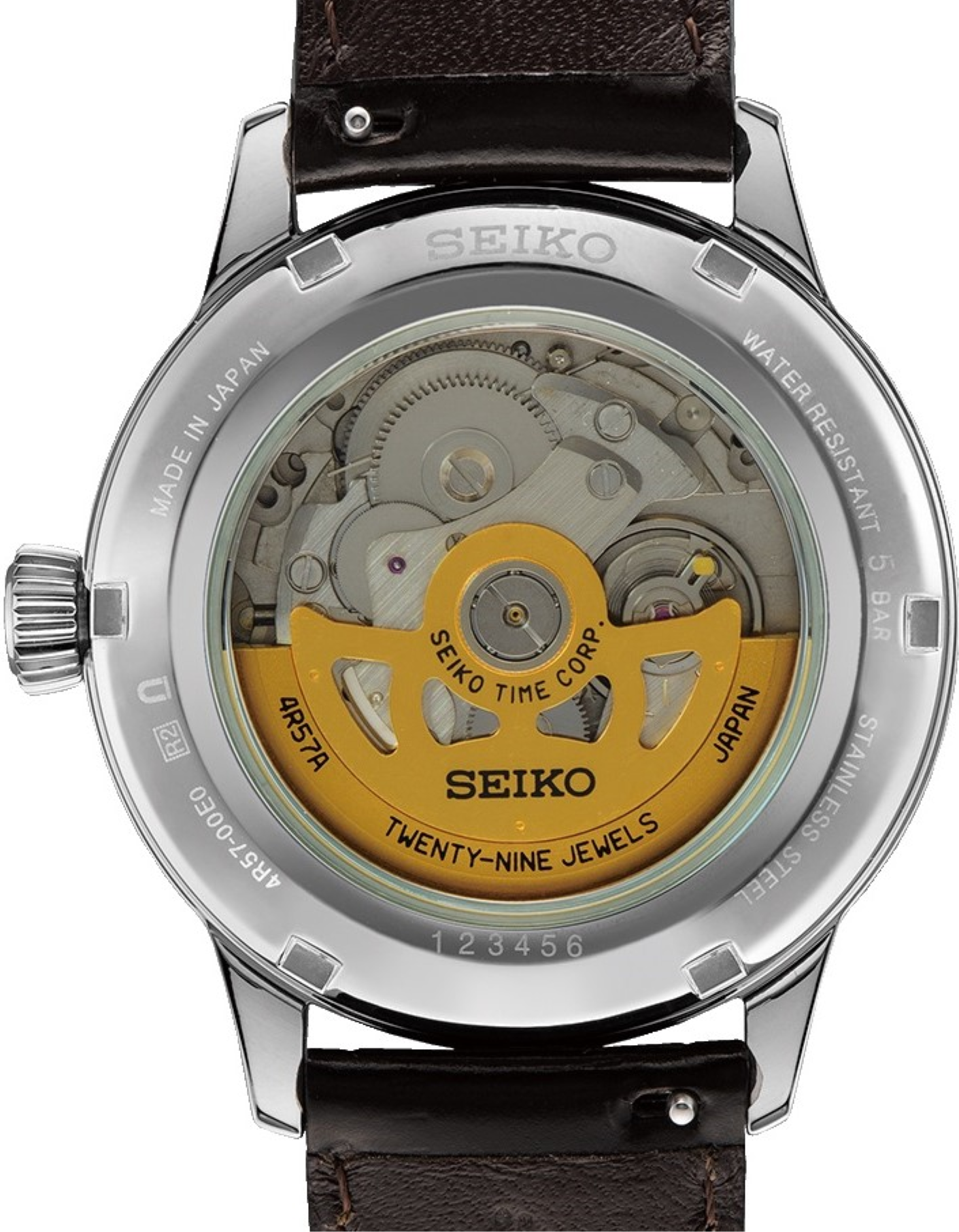 • Funkce a popis:Čas, datum, ukazatel rezervy chodu, strojek vlastní výroby (in-house) automatic Japan Seiko Caliber 4R57 (29 kamenových uložení), rezerva chodu 41 hodin, polokmity setrvačky 21.600/h = přesnost chodu 4 - 7 vteřin denně, vlásek setrvačky - Seiko Spron 510 (odolný vůči otřesům a běžnému magnetickému poli pro stabilní přesnost chodu), materiál hnací pružiny (pera) - Seiko Spron 510 (pero je antimagnetické a po celou dobu své životnosti zachovává stejnou tvrdost a pružnost, což je důležité pro trvalou a konstantní přesnost chodu strojku), hodinky jsou odolné magnetismu o síle 4.800 A/M (60 Gaussům = 5 cm, pro představu - mobilní telefon vzdálen od hodinek 5 cm zasahuje hodinky magnetickým polem o síle 400 A/M a přiblížíme-li hodinky na dotek k telefonu, hodinky zasáhne magnetické pole silou až 16.000 A/M), automatický nátah (hodinky se natahují pohybem ruky) + ruční nátah (hodinky lze natáhnout/dotáhnout i ručně korunkou, rotor samonátahu má oboustranný nátah, regulace přesnosti - ETACHRON (minimální vůle vlásku v zámečku regulační ručky zajišťuje vysokou přesnost hodinek), nárazuvzdor setrvačky Diashock (Seiko) = hodinky jsou již slušně odolné vůči nárazu (otřesu) či pádu, hodinky disponují funkcí strojku "Hacking" (při vytažení korunky do nejzažší polohy pro řízení ručiček se zastavuje vteřinová ručička), hodinky splňují normu antimagnetičnosti ISO 764