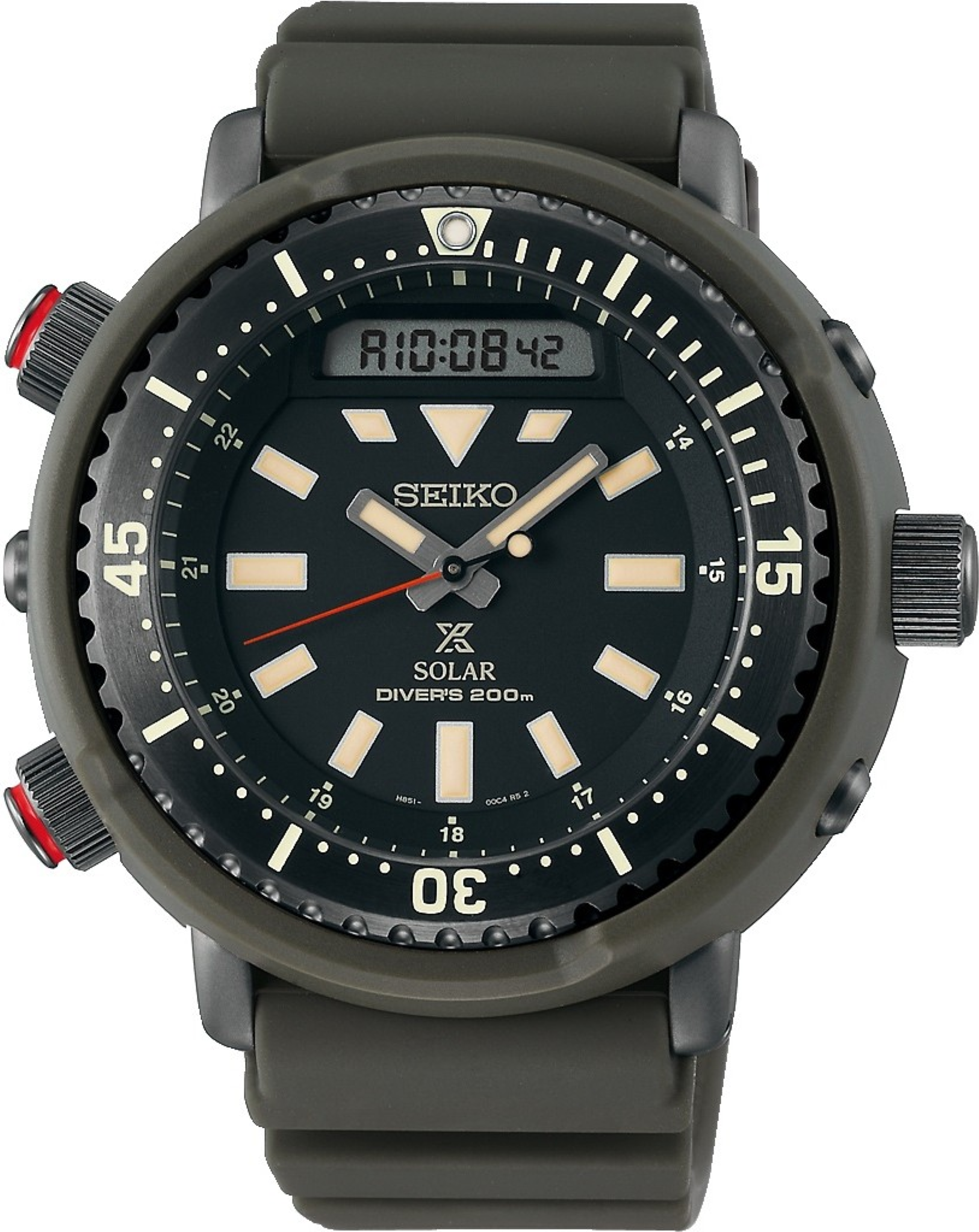 • Funkce a popis:Čas, kombinovaný číselník - analogový a digitální, strojek Japan Seiko Calibr H851 - solární pohon (rezerva chodu až 10 měsíců při plném nabití), funkce alarmu (denní alarm), výstražná funkce baterie, funkce úspory energie, chronograf až 100 hodin v krocích po 1/100 sekundy, plně automatický kalendář opravený k 31. prosinci 2100, funkce LED (vestavěné osvětlovací světlo), funkce úspory energie, ochranný kryt pouzdra z tvrzeného plastu tzv. shroud, chránící černou otočnou lunetu (se stupnicí pro snadné měření doby ponoru), ručičky a indexy jsou opatřeny svítící vrstvou LumiBrite (nový druh luminiscenční barvy - od. r. 1995 - který svítí jasněji a déle než běžná luminiscenční vrstva