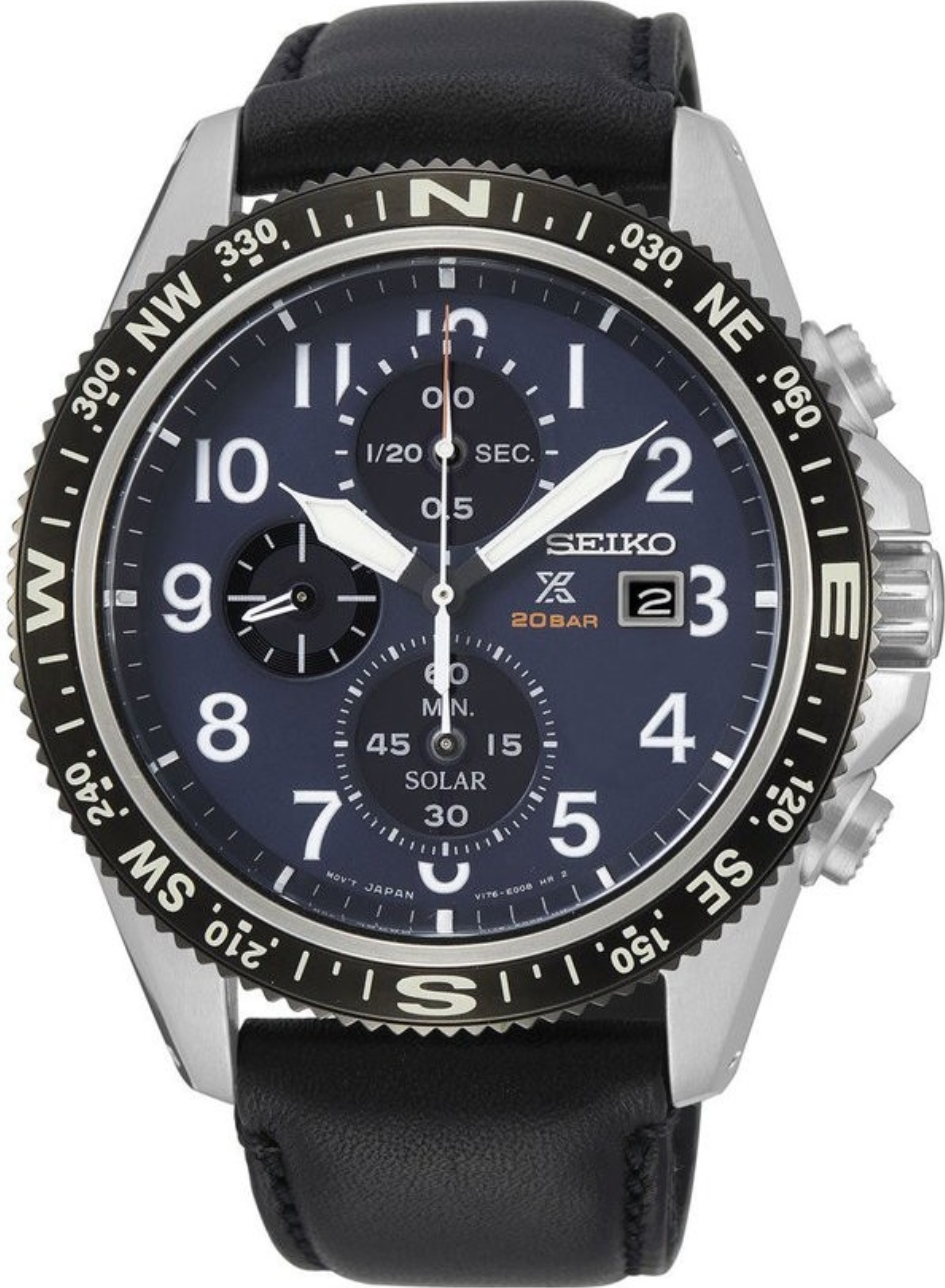 • Funkce a popis:Čas, datum, solární nabíjení s rezervou chodu až 6 měsíců při plném nabití, calibr Seiko V176, chronograf = stopky, kompas na lunetě, hodinky disponují funkcí strojku "Hacking" (při vytažení korunky do nejzažší polohy pro řízení ručiček se zastavuje vteřinová ručička), ručičky a indexy jsou opatřeny svítící vrstvou LumiBrite (nový druh luminiscenční barvy - od. r. 1995 - který svítí jasněji a déle než běžná luminiscenční vrstva)