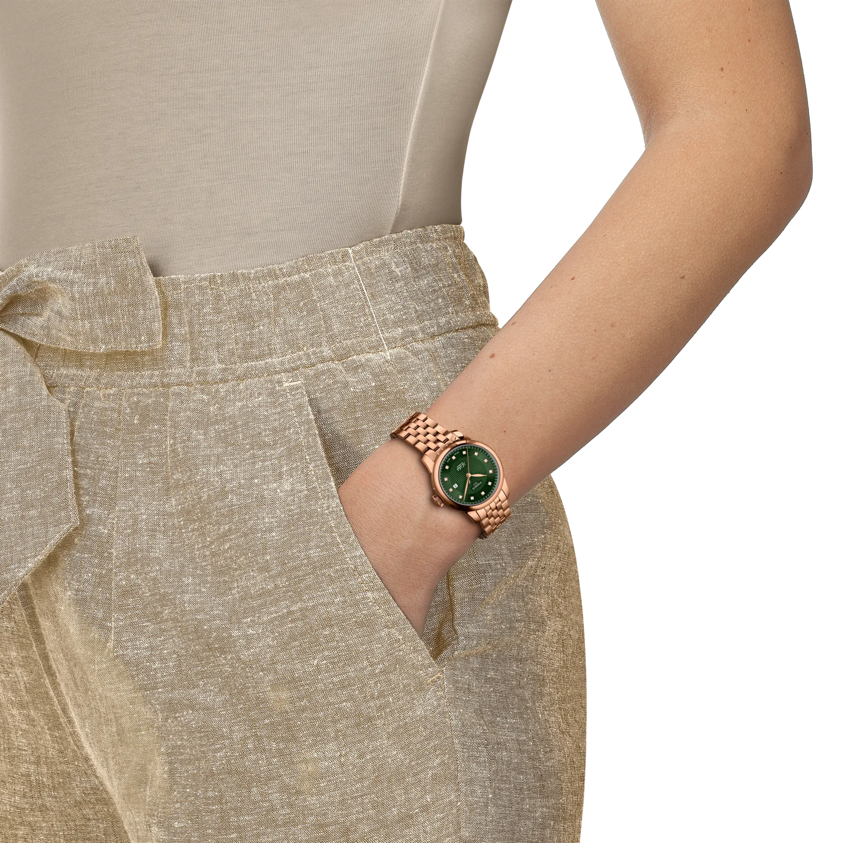 Zelený ciferník vyniká luxusním provedením, kde klasické římské číslice nahrazuje dvanáct třpytivých diamantů