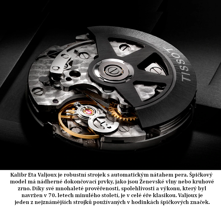tvary, vypouklá či zaoblená až po kombinaci těchto variant. Dnes jsou již všechny hodinky značky Tissot osazeny těmito sklíčky pro trvanlivou krásu a čitelnost hodinek. Kalibr Eta Valjoux je robustní strojek s automatickým nátahem pera. Špičkový