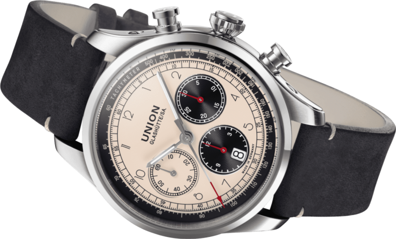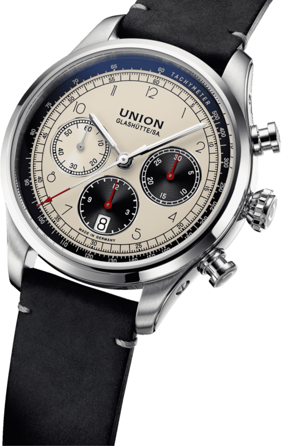 • Funkce a popis:Čas, datum, chronograf = stopky, automatický strojek Germany cal. UNG-27.S1 upravovaný ručně hodinářem pro maximální možnou kvalitu a estetiku (25 kamenových uložení), polokmity setrvačky 28.800/h = přesnost chodu 2 - 4 vteřiny denně, křemíkový vlásek - téměř antimagnetický s bezkonkurenční stabilitou pro přesnost chodu a větší stabilitou proti případným nárazům či otřesům hodinek během nošení (zvyšuje přesnost hodinek), rezerva chodu = 65 hodin, krokové ústrojí ocel/kámen, automatický nátah (hodinky se natahují pohybem ruky) + ruční nátah (hodinky lze natáhnout/dotáhnout dle potřeby i ručně korunkou, ručičky a indexy jsou opatřeny tenkou vrstvou luminiscence (luminiscenční vrstva po nasvícení dlouhou dobu svítí, což je praktické za šera a v noci)
