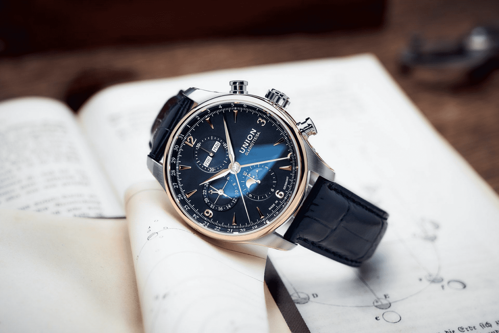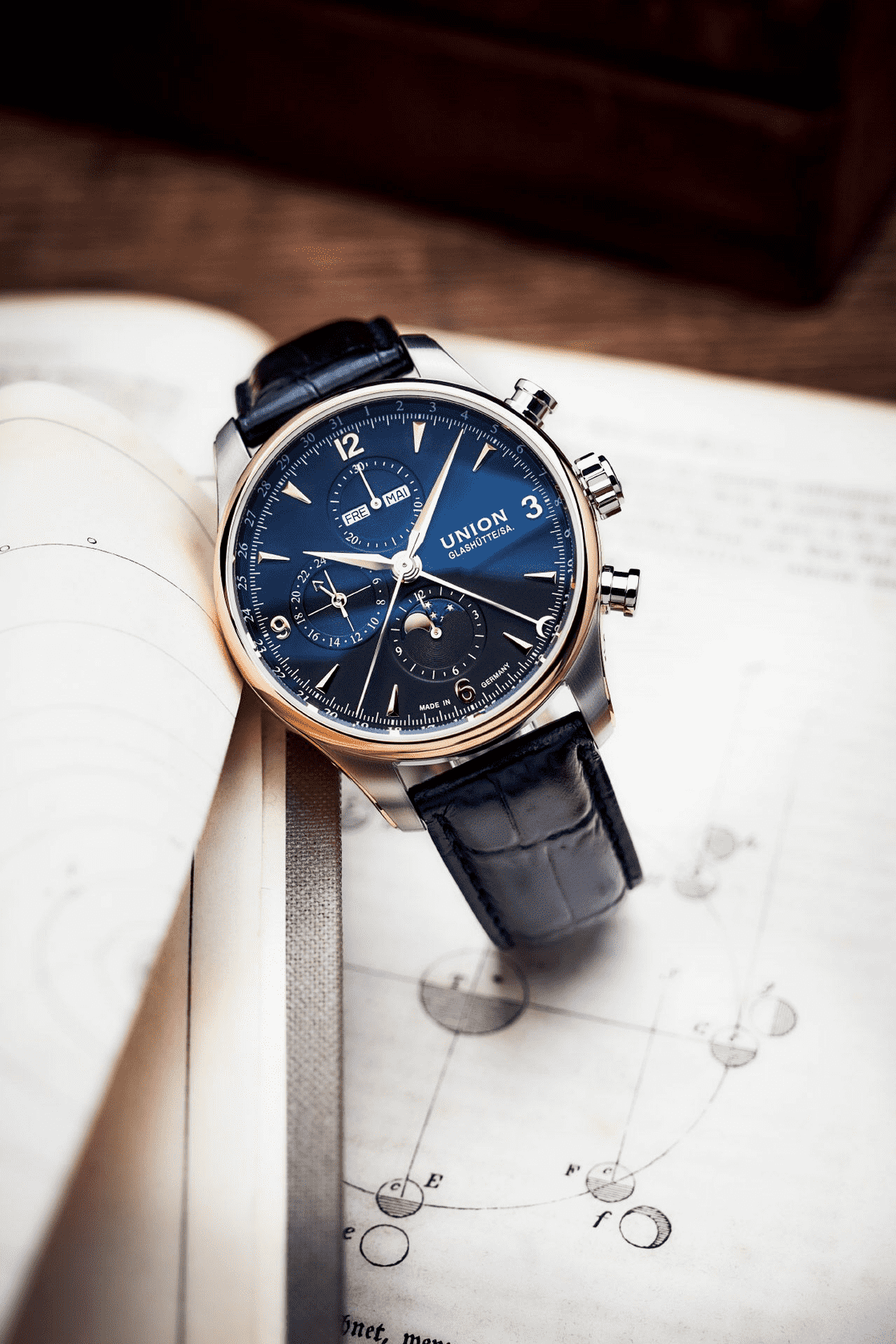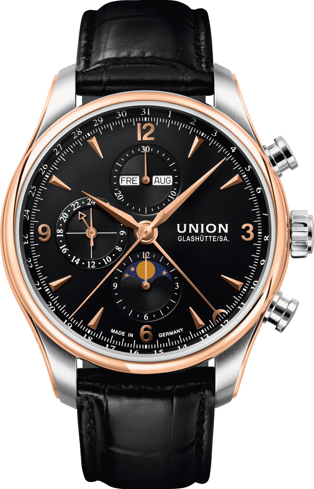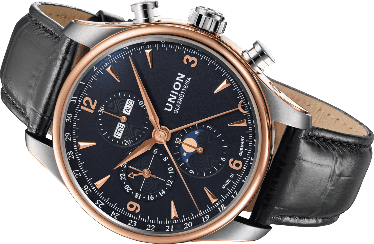 Zobrazení fáze měsíce je jednou z nejtradičnějších komplikací v hodinářství. Union Glashütte představuje nadčasově elegantní iteraci tohoto designového prvku, ve kterém je kulaté pouzdro o průměru 44 mm, vyrobené z nerezové oceli a 18karátového růžového zlata (luneta pouzdra a prvky pouzdra)Tlačítka na mechanismu chronografu jsou doplněna diskrétním korektorem umístěným na 10. hodině, který uživateli umožňuje samostatně nastavit den v týdnu.  ...