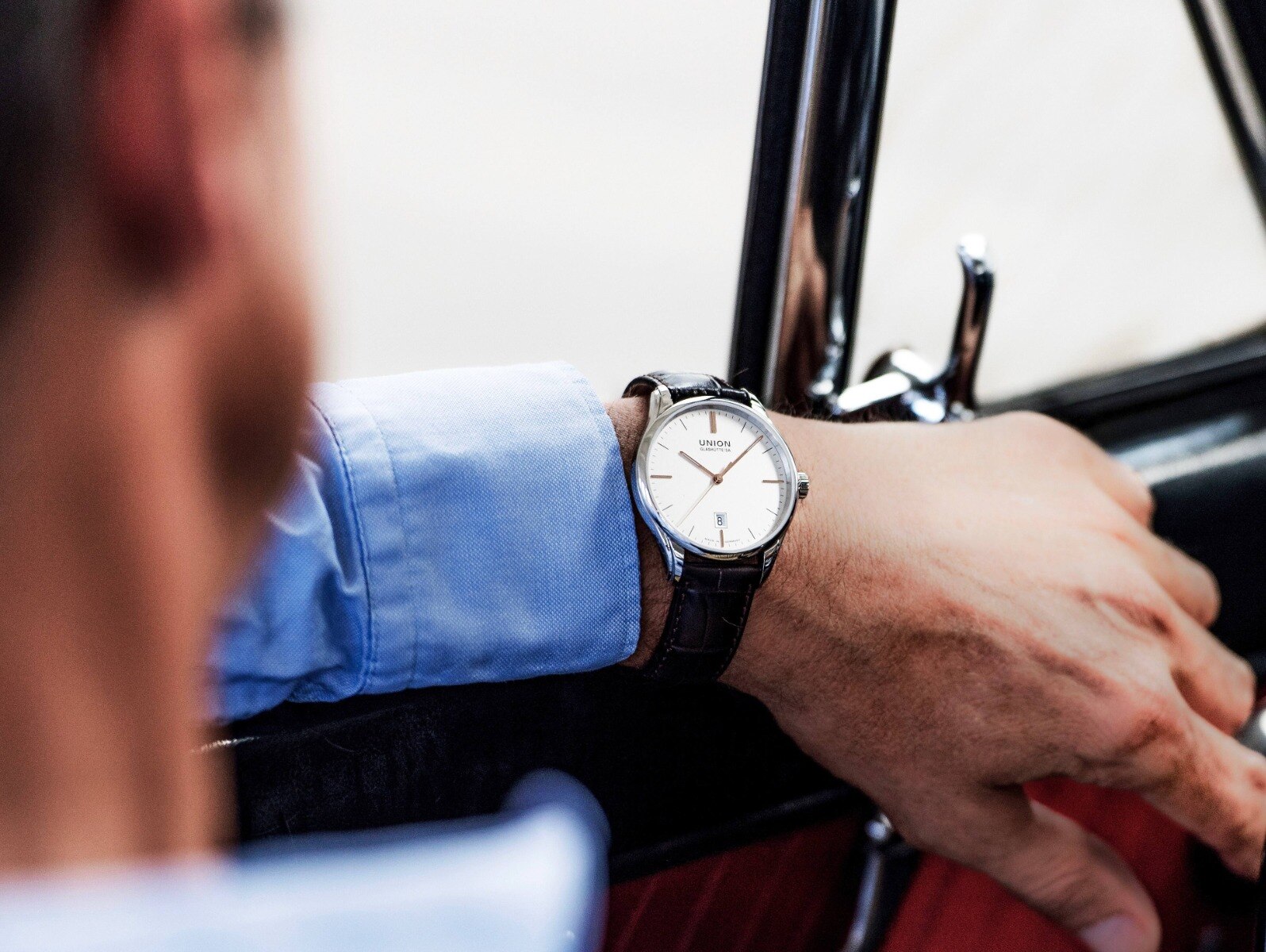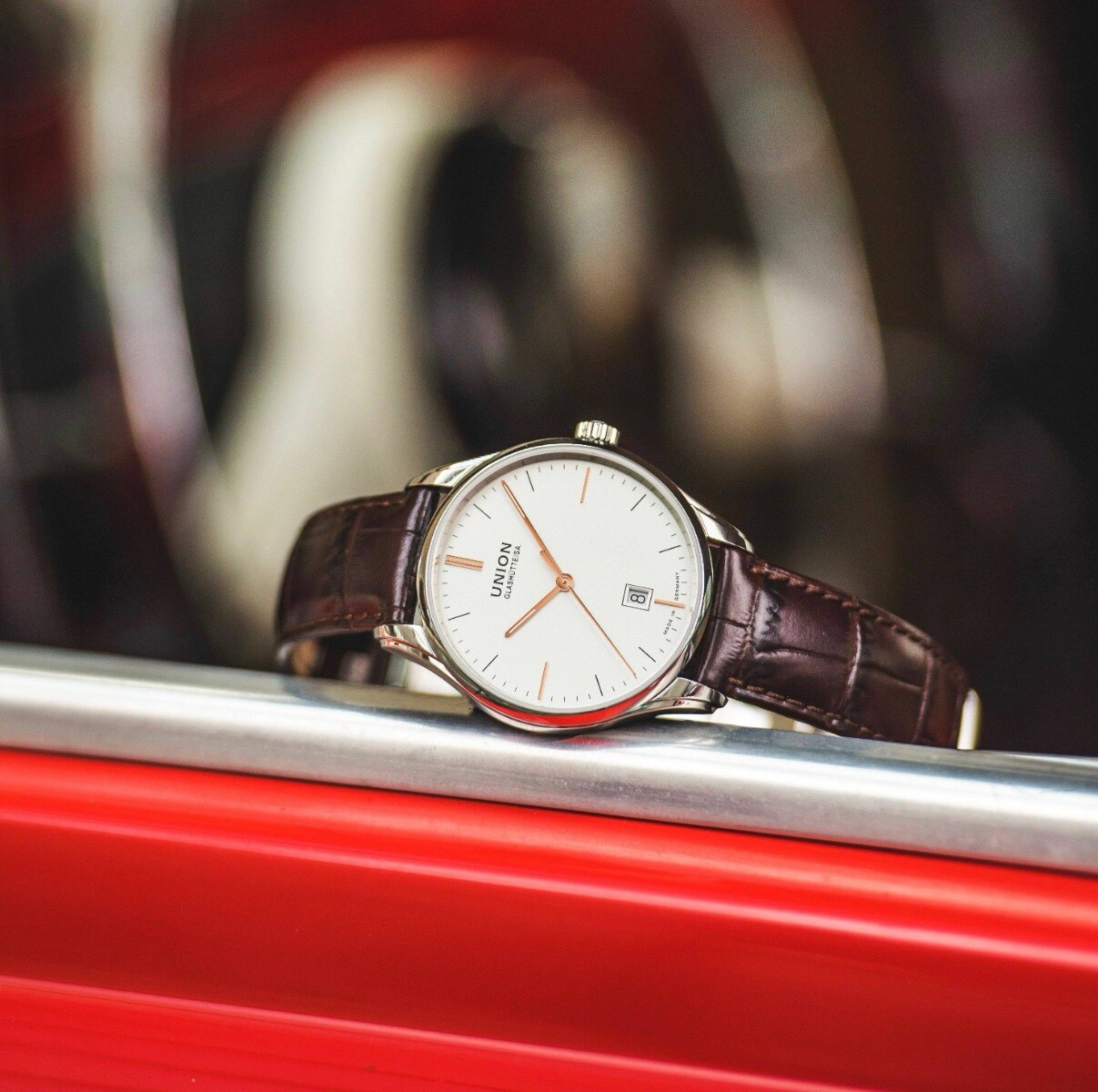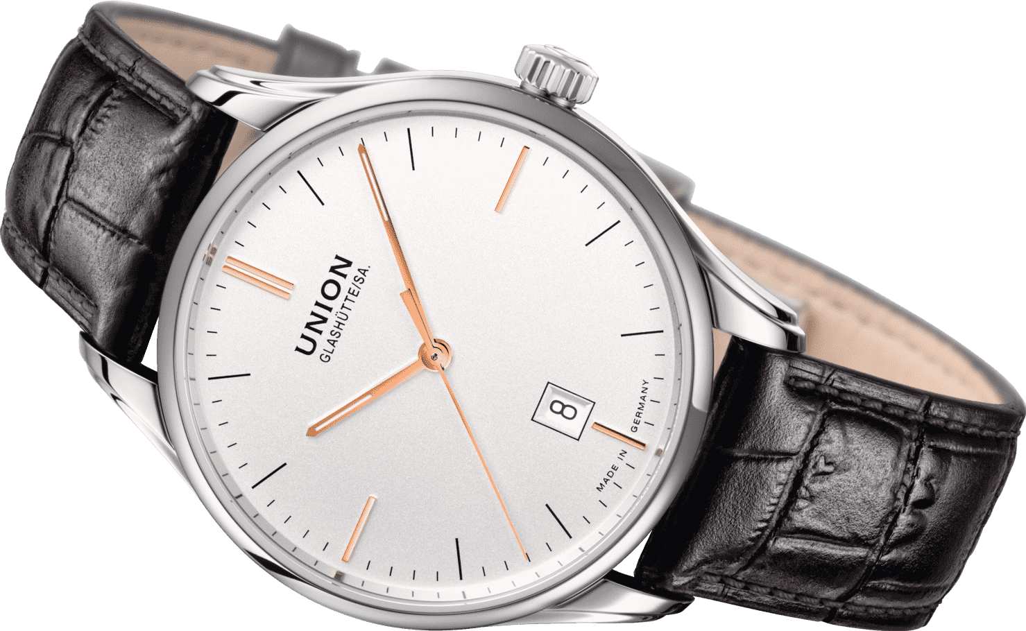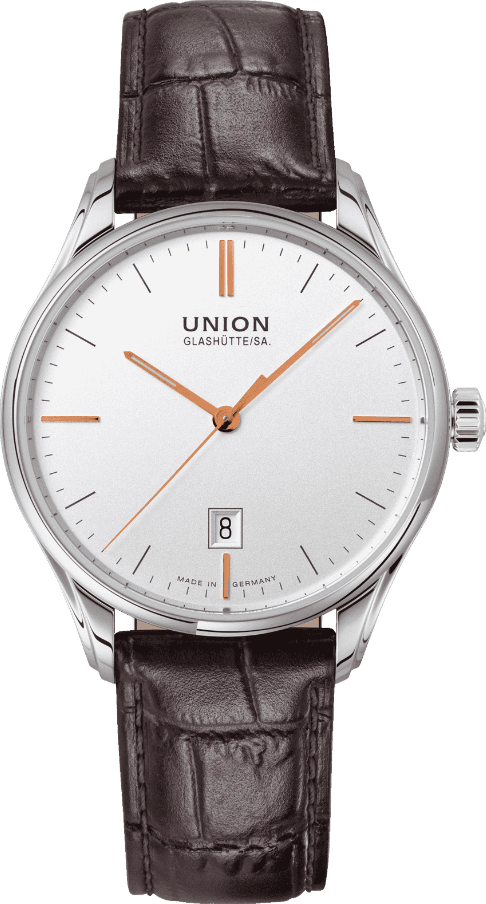 Pouzdro Viro Date z nerezové oceli s průměrem 41 mm a prakticky bez obrouček zajišťuje zcela nerušený výhled a moderní konzervativní vzhled. Oboustranné antireflexní safírové sklíčko poskytuje nejlepší možný výhled na číselník. Hnědý řemínek z teletiny s povrchovou úpravou z krokodýlí kůže znamená, že hodinky pohodlně sedí na zápěstí a dotváří profil těchto hodinek.