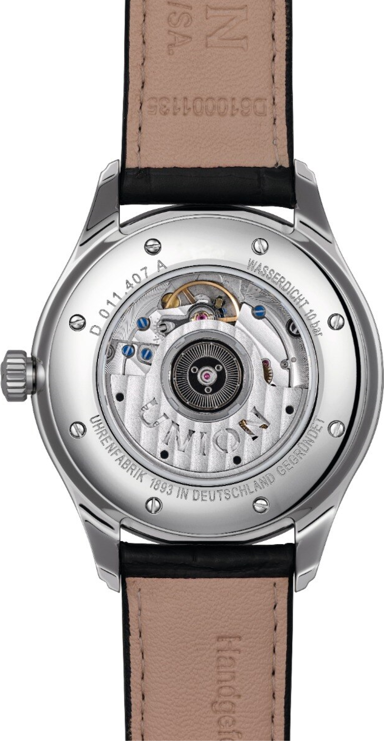 • Funkce a popis:Čas, datum, automatický strojek Germany cal. U2892A2 (základ Swiss Eta 2892) upravovaný ručně hodinářem pro maximální možnou kvalitu a estetiku (21 kamenových uložení), polokmity setrvačky 28.800/h = přesnost chodu 2 - 4 vteřiny denně, jemná regulace pro vysokou přesnost hodinek, rezerva chodu = 42 hodin, krokové ústrojí ocel/kámen, výška stroje 3,60 mm, automatický nátah (hodinky se natahují pohybem ruky) + ruční nátah (hodinky lze natáhnout/dotáhnout dle potřeby i ručně korunkou, ručičky jsou opatřeny tenkou vrstvou luminiscence (luminiscenční vrstva po nasvícení dlouhou dobu svítí, což je praktické za šera a v noci)