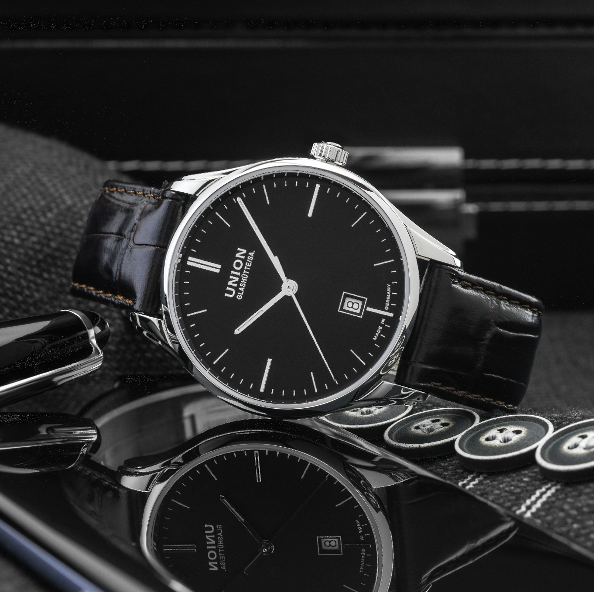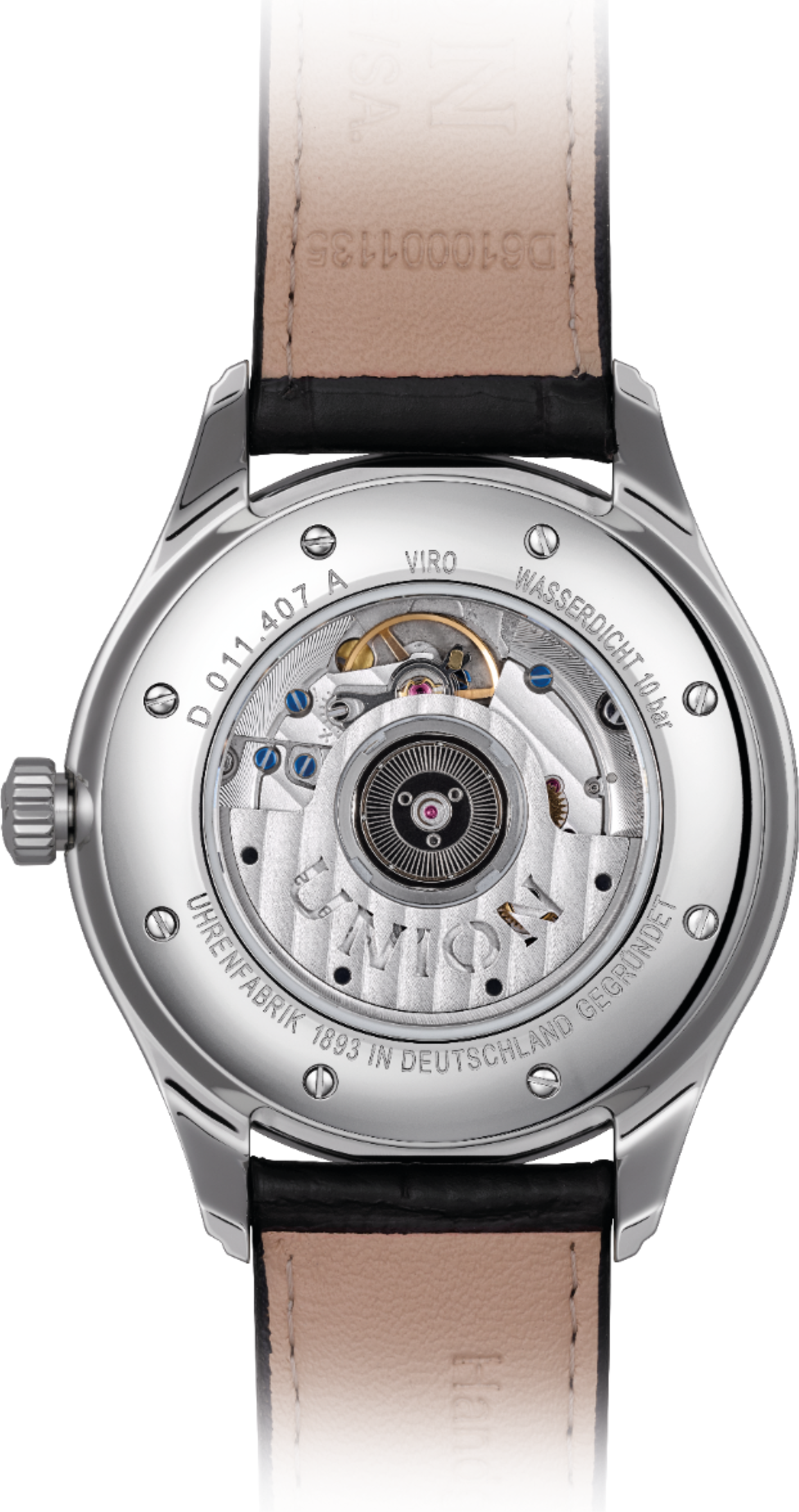 Pouzdro Viro Date z nerezové oceli s průměrem 41 mm a rámečkem prakticky bez obrouček zajišťuje zcela nerušený výhled a decentní, dobře proporcionální vzhled. Oboustranné antireflexní safírové sklíčko zaručuje ten nejlepší možný výhled na ciferník. Hodinky ve spojení s hnědým koženým řemínkem z teletiny s elegantním povrchem z krokodýlí kůže pohodlně sedí na zápěstí a doplní zejména tmavé oblečení.