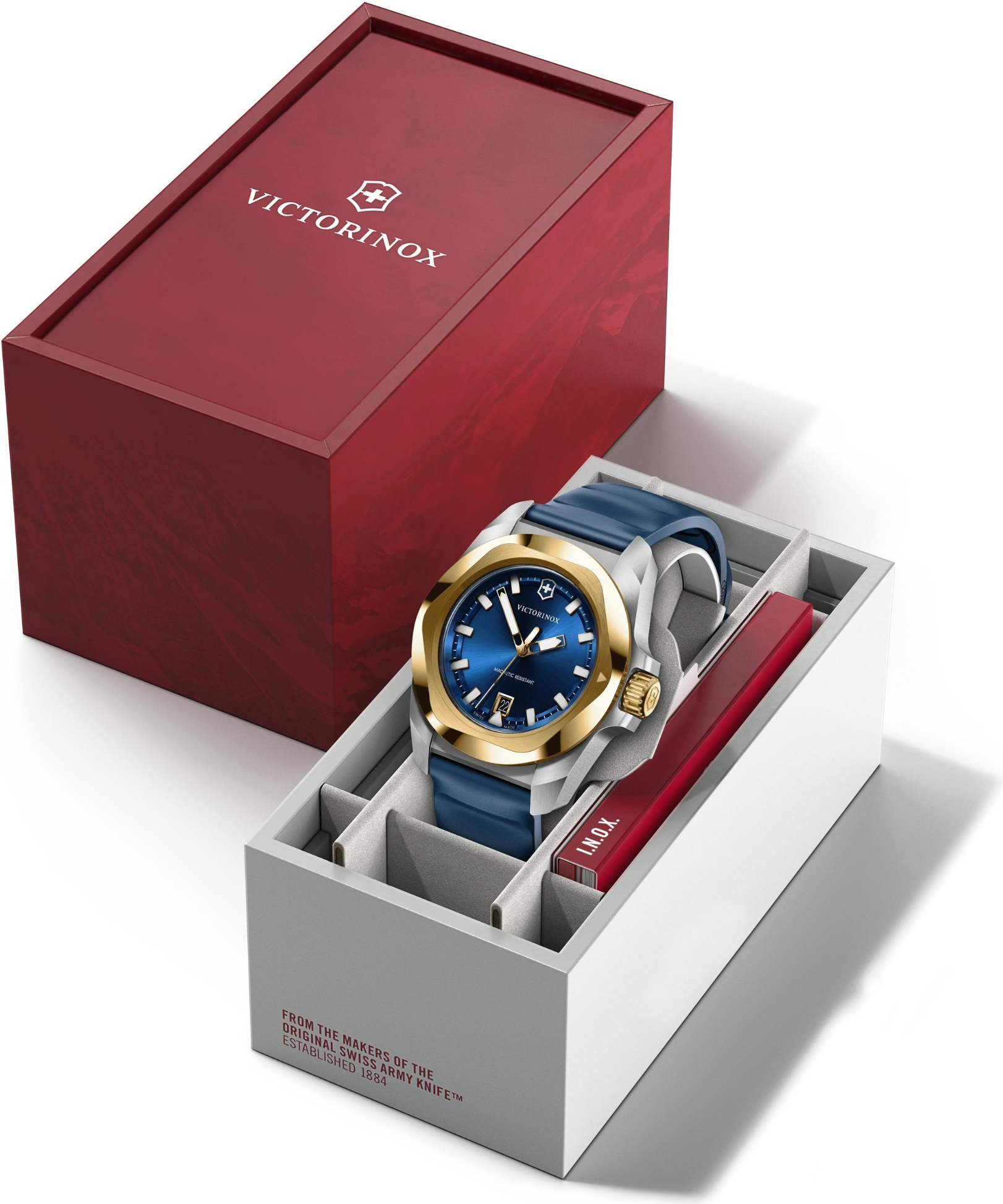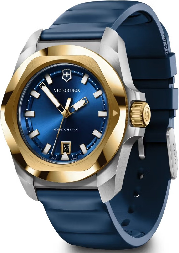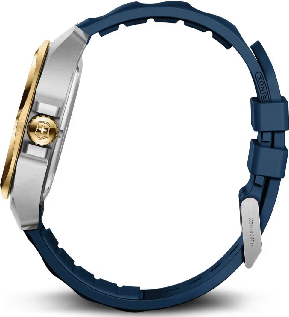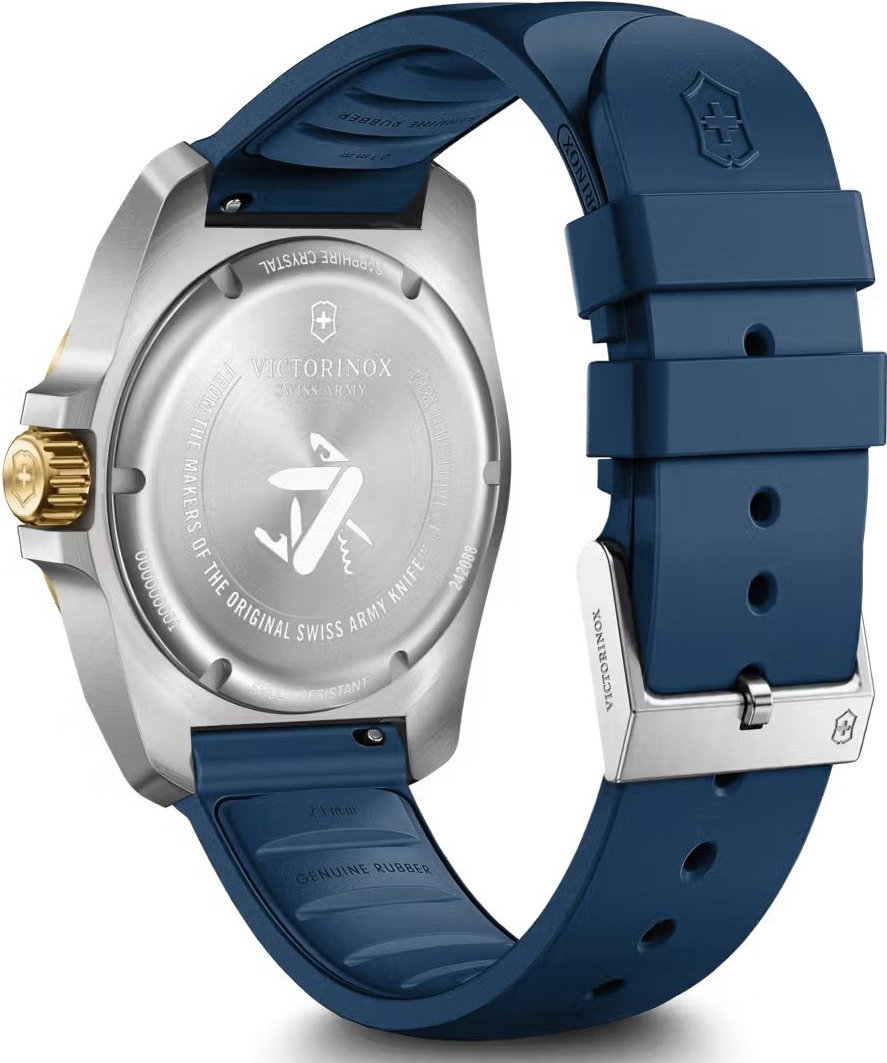 Victorinox I.N.O.X. Quartz 242088 patří do stejné nové generace jako reference 242085, ale přináší výraznější a luxusněji laděný barevný akcent. Stříbrné ocelové pouzdro doplňuje luneta ve zlatém tónu a modrý pryžový řemínek, což vytváří kombinaci, která je sportovní, svěží a současně velmi atraktivní na pohled. Tato reference osloví muže, kteří chtějí odolné švýcarské hodinky s moderní konstrukcí, ale současně se nechtějí držet čistě neutrálních barev. Číselník je metalický a má ...
