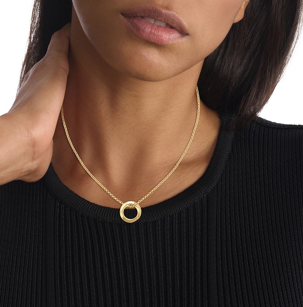 Slušivý dámský náhrdelník z dílny značky Calvin Klein, vyrobený z kvalitní oceli, pozlacený žlutým zlatem, zdobený ocelovým kroužkem s vyrytým logem značky, délka náhrdelníku: 45 cm, zapínání na klasickou karabinku.