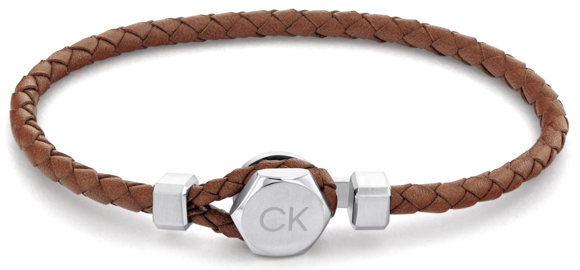 Elegantní pánský náramek z dílny značky Calvin Klein, vyrobený z hnědé kůže, doplněný o ocelové zapínání, délka náramku: 19,5 cm, nechybí iniciály značky.