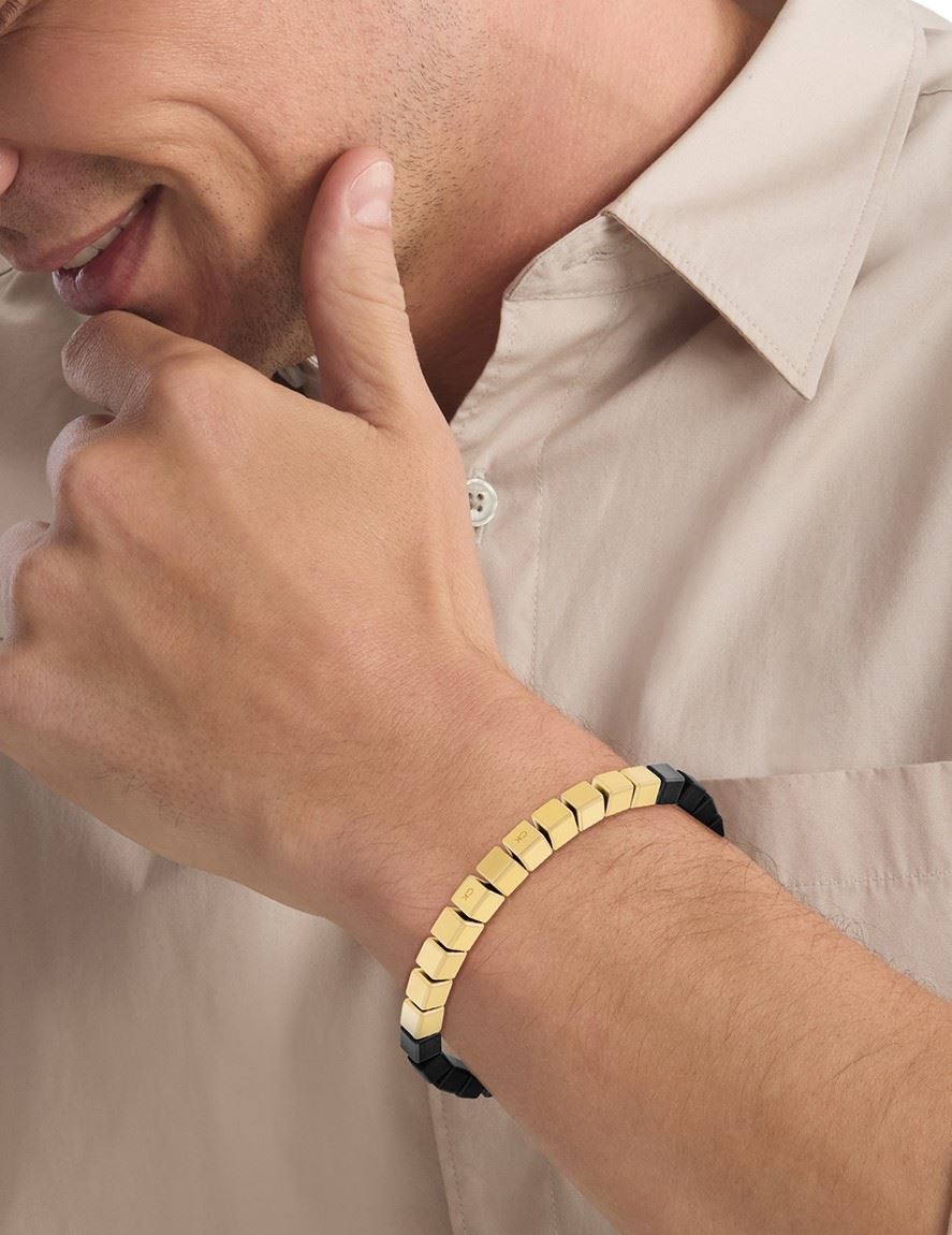 Moderní náramek z dílny značky Calvin Klein, vyrobený ze dřeva a oceli, pozlacený oblíbeným žlutým zlatem, bez zapínání, snadné navlékání, délka náramku: 19,5 cm.