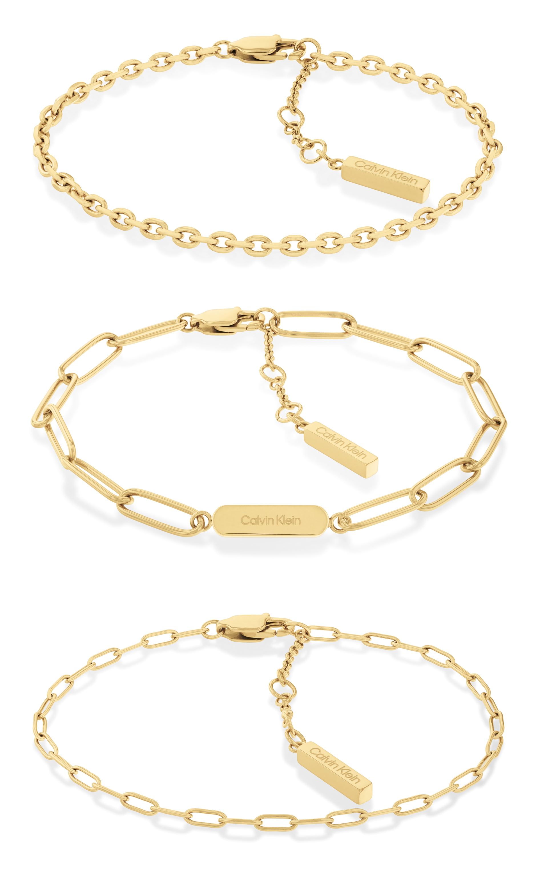Elegantní souprava náramků z dílny značky Calvin Klein, vyrobené z vysoce kvalitní oceli, žluté pozlacení propůjčuje šperku punc luxusu, délka náramků: 16 cm s možností prodloužení o 2 cm, zapínání na karabinku, nechybí ocelová destička s logem značky na konci zapínání.