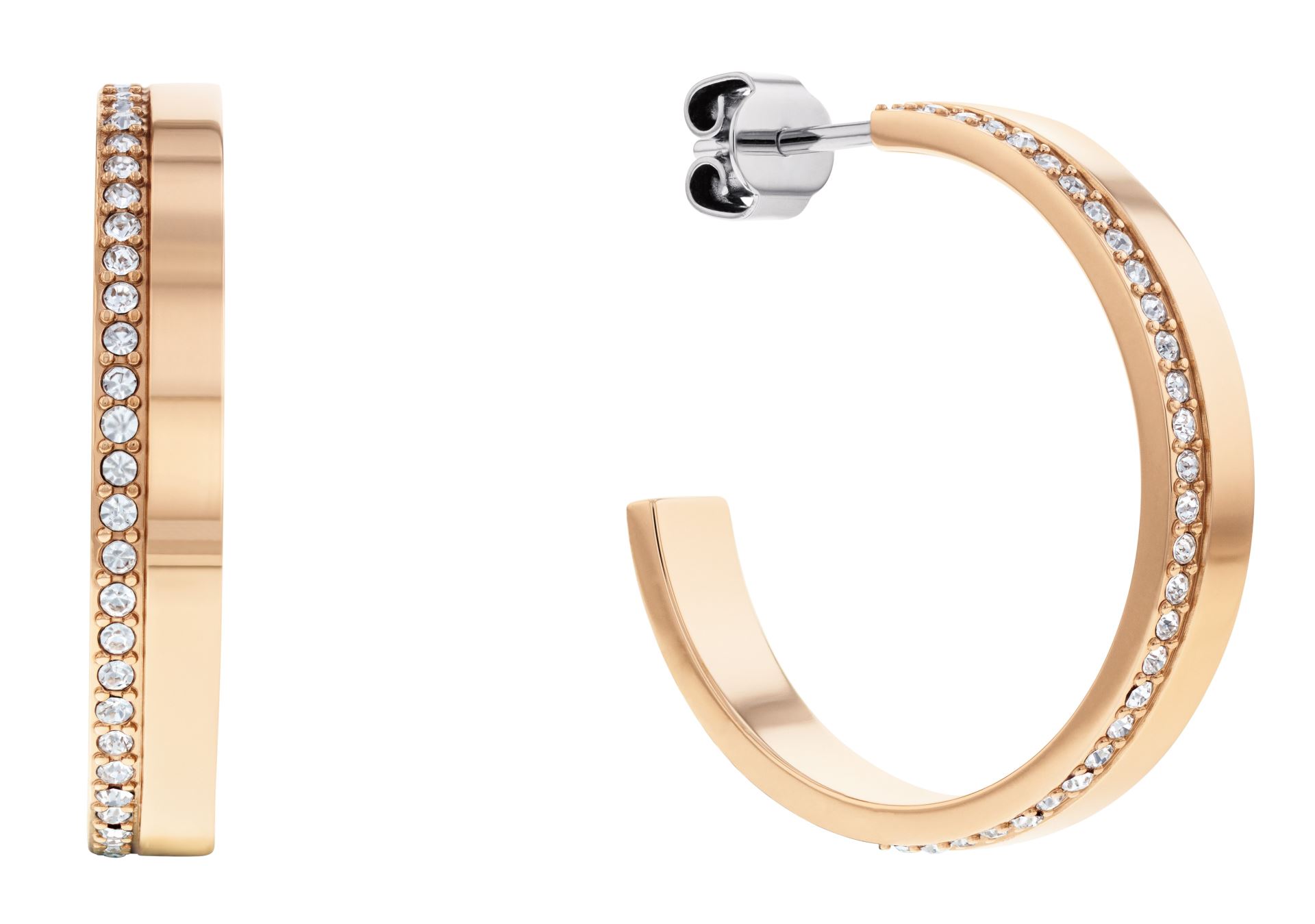 Elegantní náušnice z dílny značky Calvin Klein, vyrobené z oceli, díky pozlacení růžovým zlatem působí šperk luxusním dojmem, oblíbený kruhový design zdobený třpytivými zirkony, průměr náušnic: 2,5 cm, bezpečnostní zapínání na puzetku.
