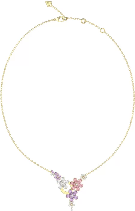 Dámský náhrdelník Guess z chirurgické oceli v barvě žlutého zlata, přívěs je zdobený růžovými a světne modrými  zirkony ve tvaru květů a motýlů.  Délka: 40,7  45,7 cm