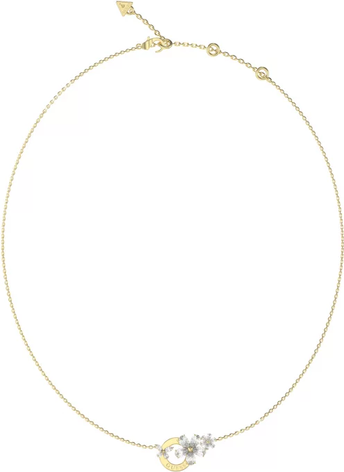 Elegantní dámský náhrdelník GUESS z chirurgické oceli v barvě zlata, přívěšek zdobený zirkony ve tvaru květů a motýlů a logem značky. Nastavitelné zapínání na 3 velikosti Délka: 40,7  45,7 cm