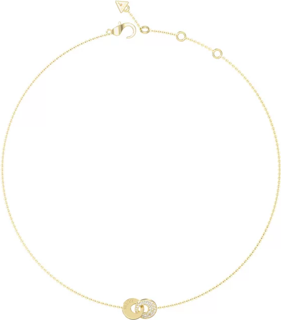 Elegantní dámský náhrdelník GUESS z chirurgické oceli v barvě zlata, přívěšek ve tvaru mincí se zirkony a názvem značky. Délka: 40,7  45,7 cm