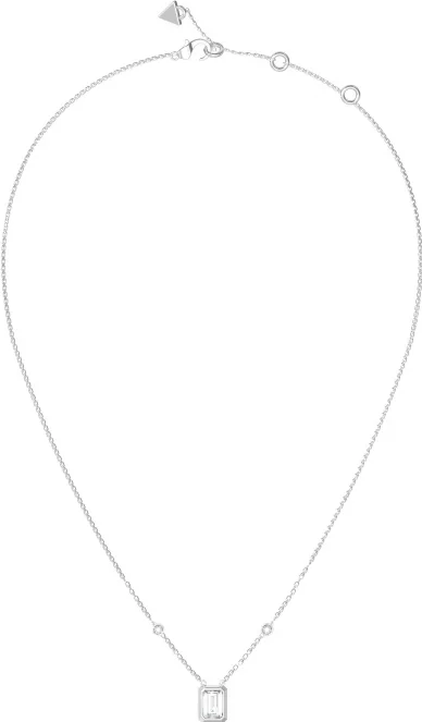 Elegantní dámský náhrdelník GUESS z chirurgické oceli v barvě stříbra, přívěšek hranatého tvaru se zirkonem a dvěma zirkony na řetízku a logo značky. Nastavitelné zapínání na 3 velikosti Délka: 40,7  45,7 cm