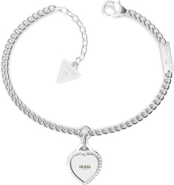 Elegantní dámský náramek GUESS z chirurgické oceli v barvě stříbra zdobený přívěškem ve tvaru srdce, čirými zirkony a názvem značky.