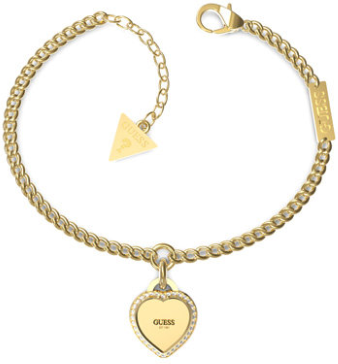Módní náramek značky GUESS ozdobí nejednu ženu, pozlacen žlutým zlatem, ozdoben přívěskem ve tvaru srdce, které je osázeno třpytivými zirkony a logem GUESS. Zapínání na klasickou karabinu s možností prodloužení.