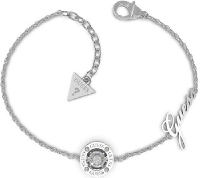 Módní náramek z chirurgické oceli ve stříbrné barvě s přívěsem uprostřed a nápisem Guess. Přívěs je zdobený kamínky Swarovski. Délka náramku je 14,6 - 18,4 cm, rozměr přívěšku je 1,1 cm.
