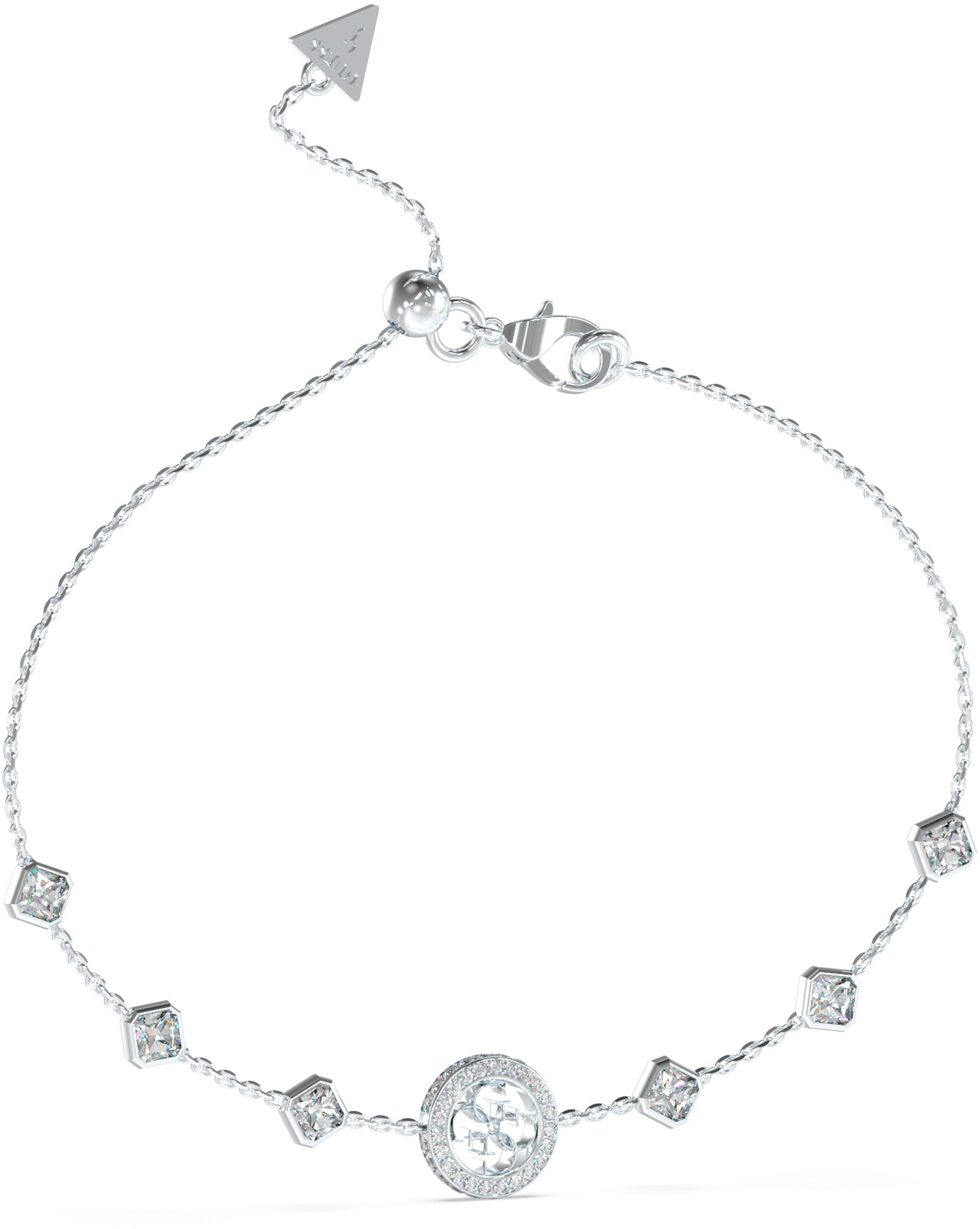 Půvabný dámský náramek z dílny značky Guess, vyrobený z velmi kvalitní oceli, zdobený pověstným 4G logemčiré zirkony dodávají náramku oslnivý třpyt, díky posuvné sponě si můžete velikost libovolně upravovat, maximální délka náramku: 21 cm.