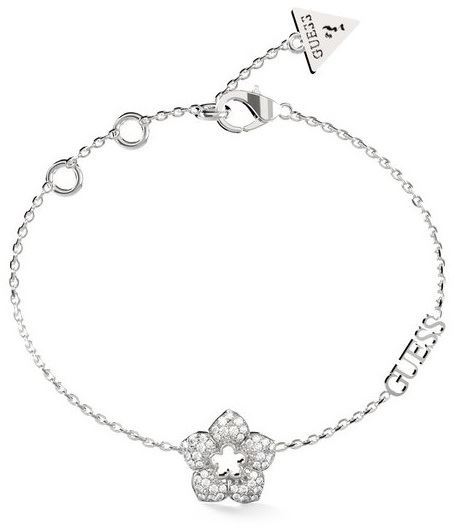Krásný náramek pro ženy značky Guess, vyrobený z kvalitní oceli, dominantou je ozdoba ve tvaru blyštivé květiny, čiré kubické zirkony se na náramku oslnivě třpytí, nechybí název značky na trojúhelníkovém přívěsku a jako ozdoba, která je součástí řetězoviny, délka náramku: 14,5 cm, s možností nastavení 3,5 cm, zapínání na karabinku.