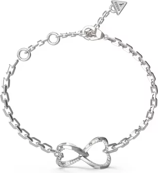 Elegantní dámský náramek GUESS z chirurgické oceli v barvě stříbrné, přívěšky ve tvaru nekonečna a srdcí se zirkony a gravírováním logem Guess. Nastavitelné zapínání na 3 velikosti Délka řetízku: 14,5 + 3,5 cm