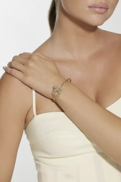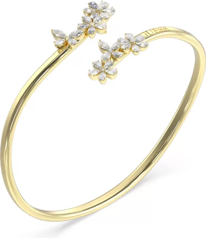 Elegantní dámský náramek GUESS ze zlacené chirurgické oceli, zdobené květy a motýlky ze zirkonů a logem značky. Průměr náramku: 4,5 x 5,5 cm