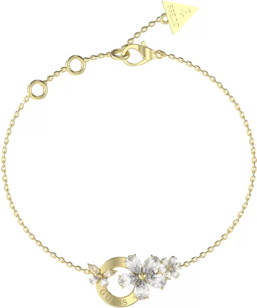Elegantní náramek Guess z nerezové oceli s přívěškem ve tvaru květů a motýlů, zdobený zirkony.