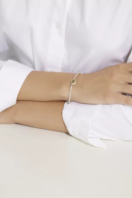 Elegantní dámský náramek GUESS z chirurgické oceli v barvě zlata zdobený zirkony a názvem značky. Délka řetízku: 14,6 + 3,8 cm