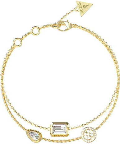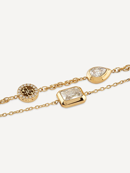 Elegantní dámský náramek GUESS z chirurgické oceli v barvě zlata, zdobený zirkony a názvem značky., v oblíbeném dvojitém provedení Délka náramku: 18,5 cm