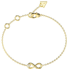Tento náramek je ze zlacené nerezové oceli. Symbol nekonečna je osazený krystaly s logem Guess. Karabinkové zapínání na 3 velikosti.