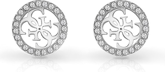 Stylové náušnice značky Guess, vyrobeny z oceli, rhodiovaný povrch - snižuje výskyt alergických reakcí a zachovává lesk šperků, náušnice zdobí legendární filigránový znak Guess, dekorovány třpytivými zirkony, průměr náušnice: 1,1 cm, zapínání na klasickou puzetku
