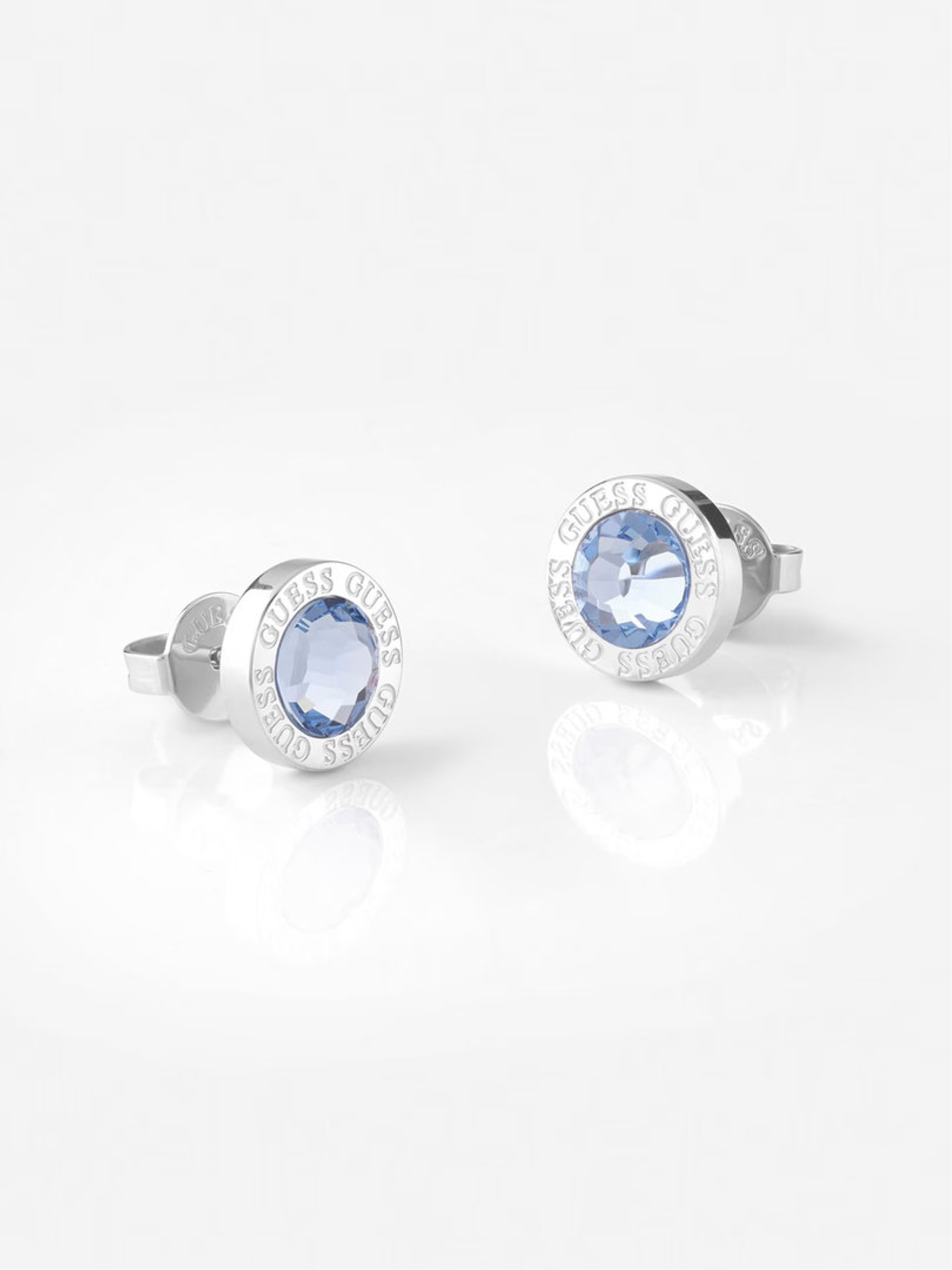 Náušnice pecky ze stříbrné nerezové oceli s modrým zirkonem a logem. Průměr: 1 cm.