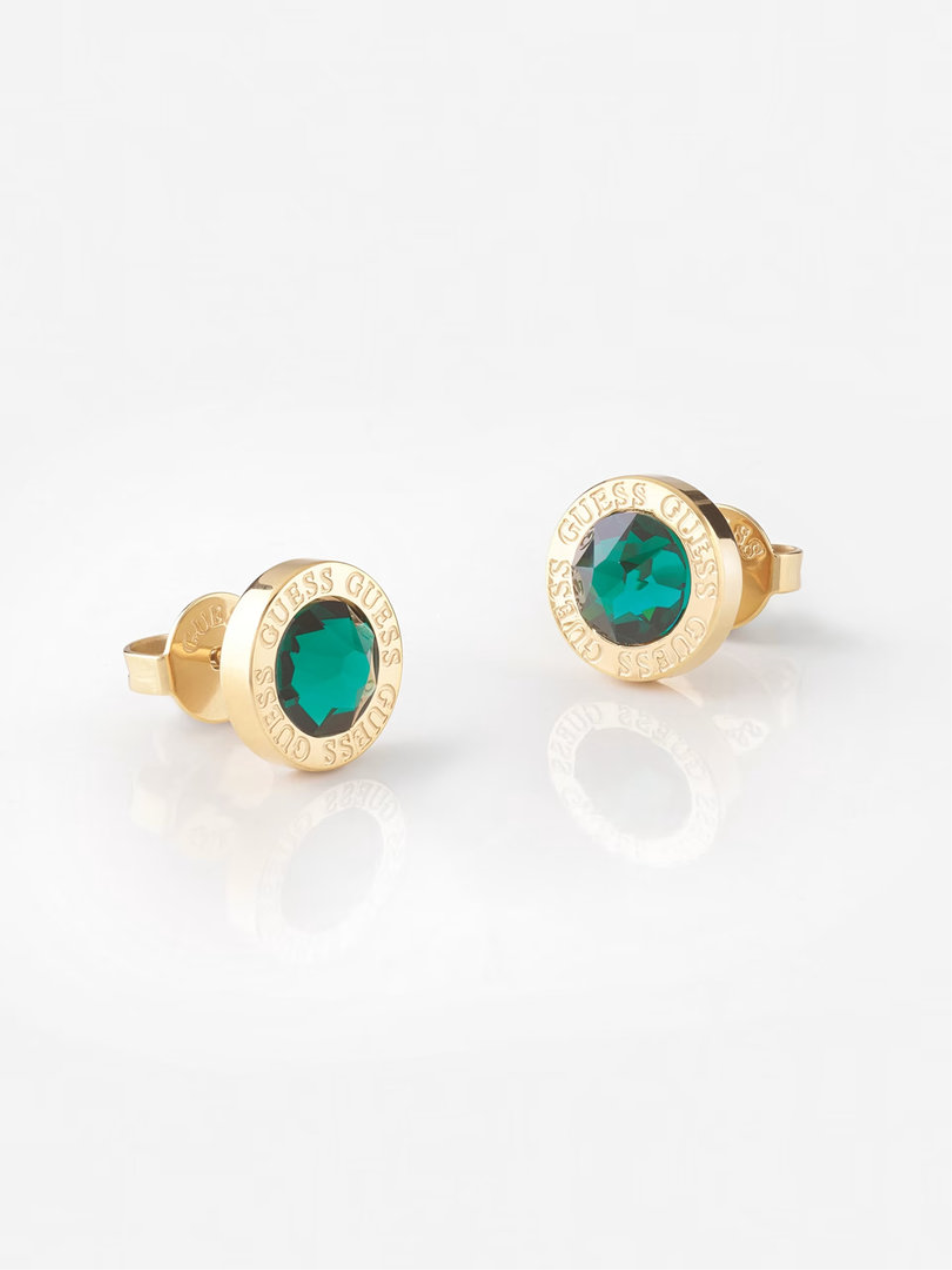 Náušnice pecky ze zlacené nerezové oceli se zeleným zirkonem a logem.