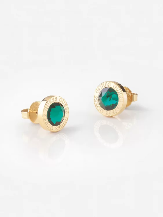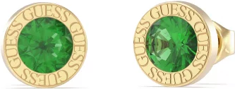Jemné náušnice zdobené zeleným zirkonem a nápisem Guess, v barvě zlatá. Průměr: 1 cm