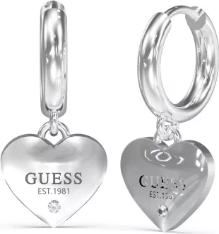 Kruhové náušnice z oceli s přívěskem, který je ve tvaru srdce s logem Guess a jedním kamínkem.