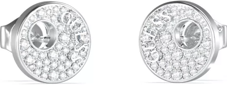 Jemné náušnice ve tvaru mince zdobené zirkony a nápisem Guess, v barvě stříbrná. Průměr: 1 cm