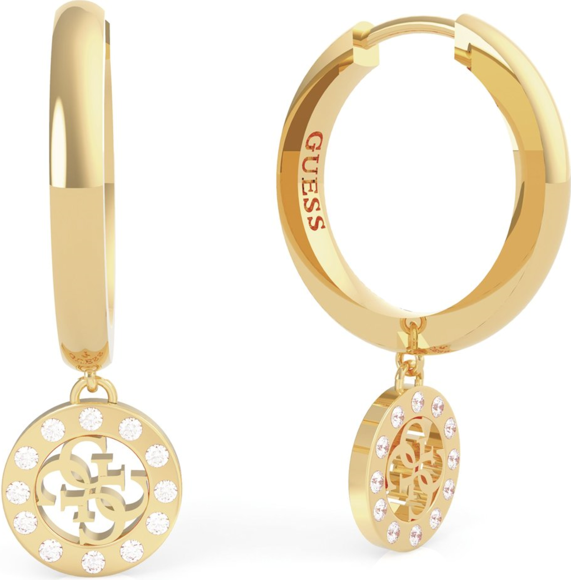 Elegantní náušnice značky Guess, vyrobeny z oceli, pozlacení žlutým zlatem dodává šperku známku luxusu, základ náušnic tvoří kruhy o průměru 1,5 cm, doplněny přívěsky, které jsou dekorované znakem Guess, průměr přívěsku: 0,8 cm, zdobené čirými třpytivými krystaly Swarovski.