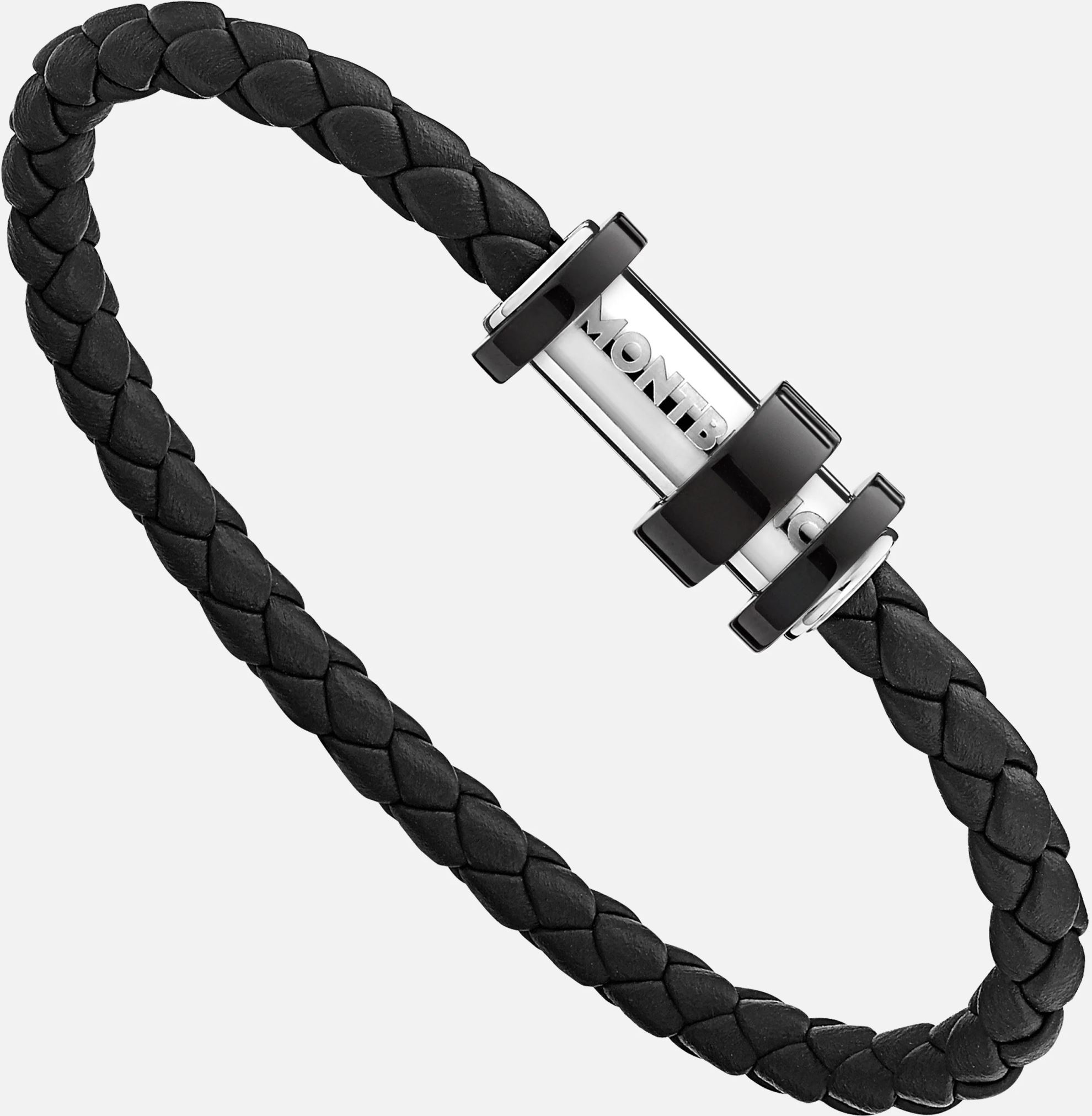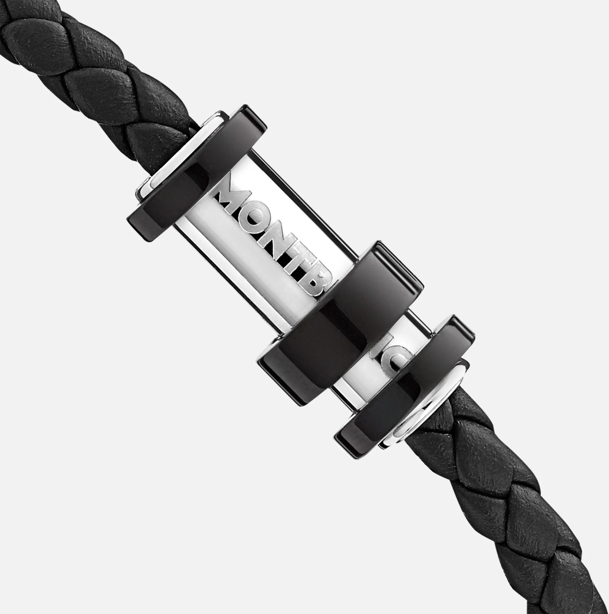 Montblanc - Náramek - MB11654868 - Armband aus geflochtenem schwarzem Leder mit Edelstahlschließe, schwarzem PVD-Finish und 3-Ringe-Motiv