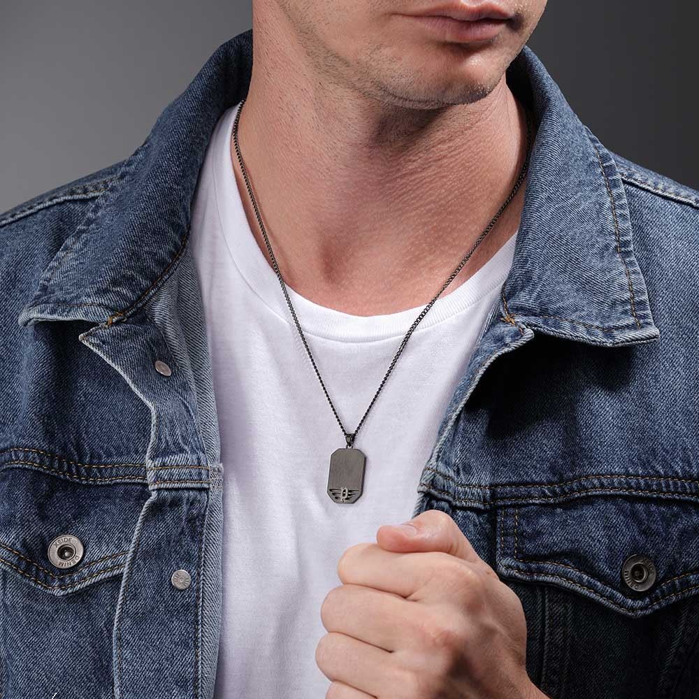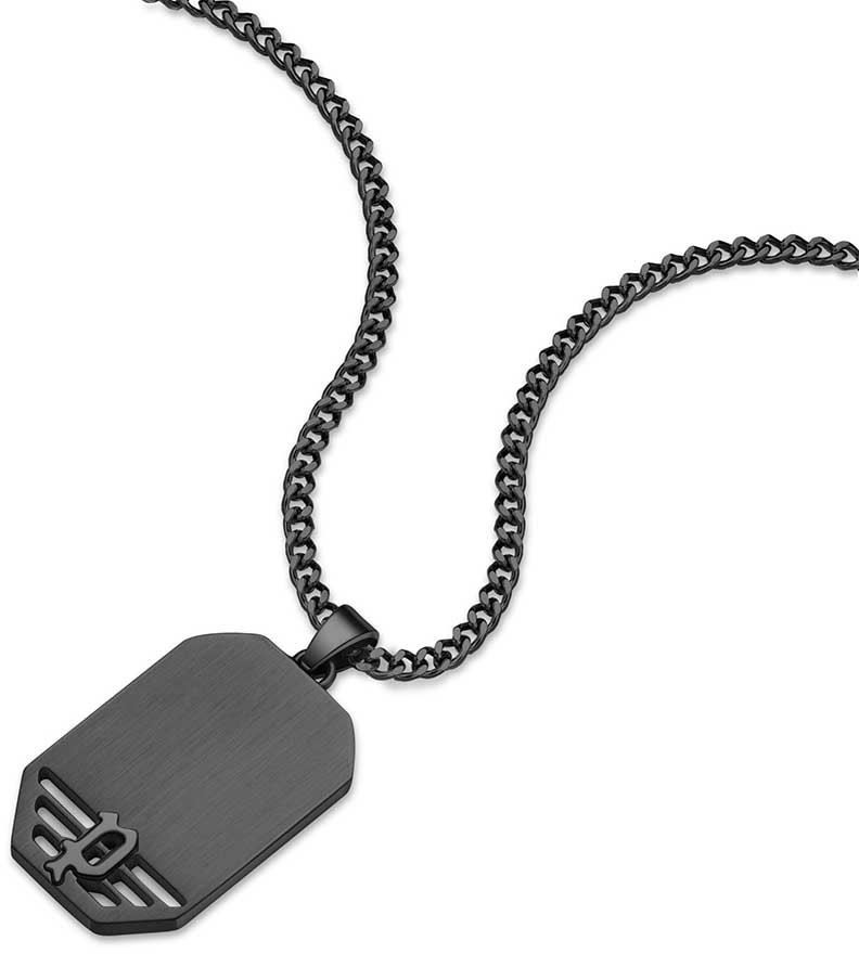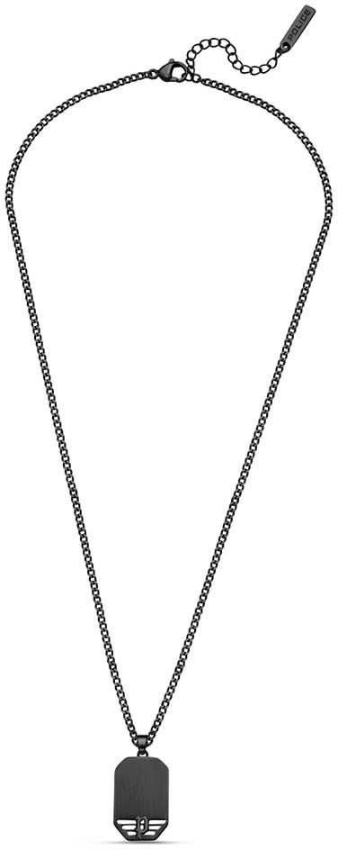 Módní náhrdelník pro muže od značky Police, vyrobený z kvalitní oceli, pokovený černým PVD povlakem, zdobený stylovým přívěskem ve tvaru vojenské známky s logem značky, délka řetízku: 50 cm s možností prodloužení o 5 cm, zapínání na karabinku.