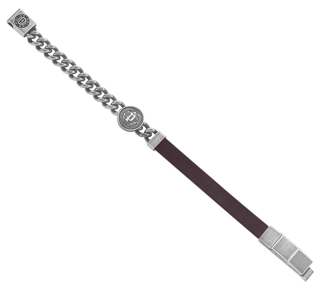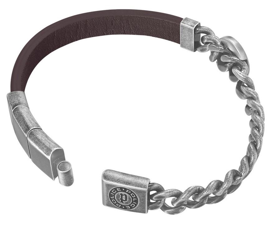 Stylový pánský náramek z dílny značky Police, vyrobený z kvalitní oceli a hladké hnědé kůže, ocel je upravená PVD pokovením, moderní design náramku doplňuje kulatá ozdoba s logem značky, délka náramku: 21 cm s možností zkrácení o 2 cm, zapínání pomocí magnetické spony.