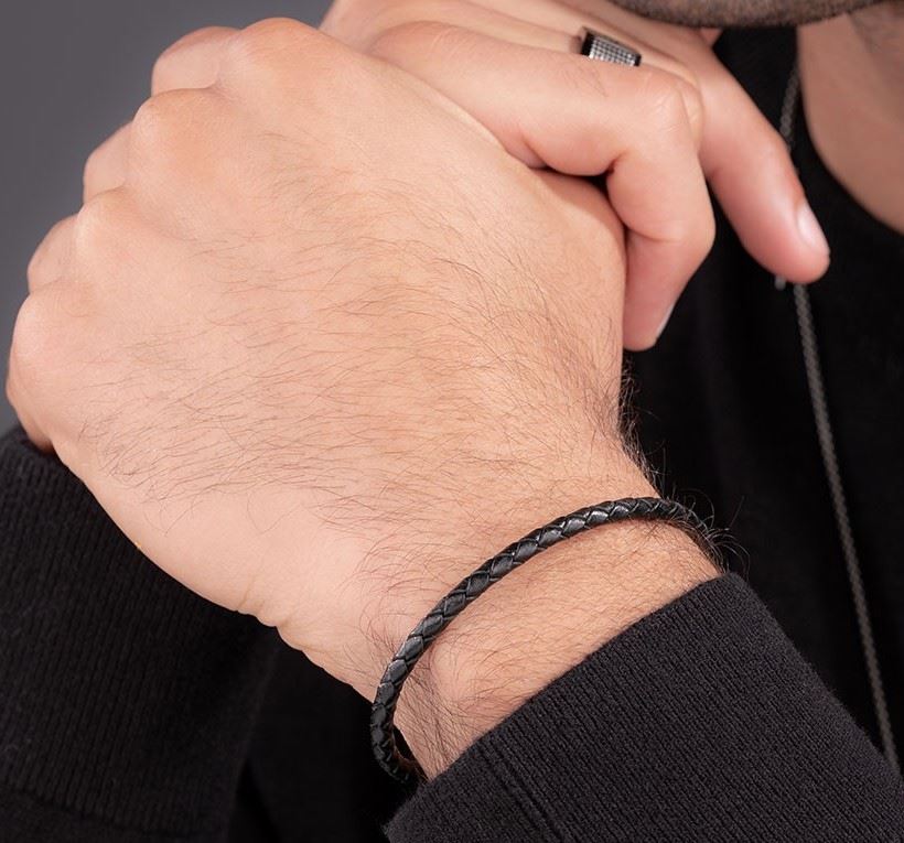 • Popis šperku:Pánský náramek z černé kůže a černé PVD chirurgické oceli. Délka 18+1 cm. Magnetické zapínání.
