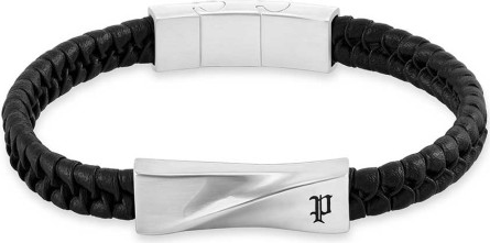 Kombinuje černou kůži s dominantním geometrickým motivem z nerezové oceli, přičemž pletený řemínek přechází do čistých ocelových linií pro kontrastní, sebevědomý dojem.