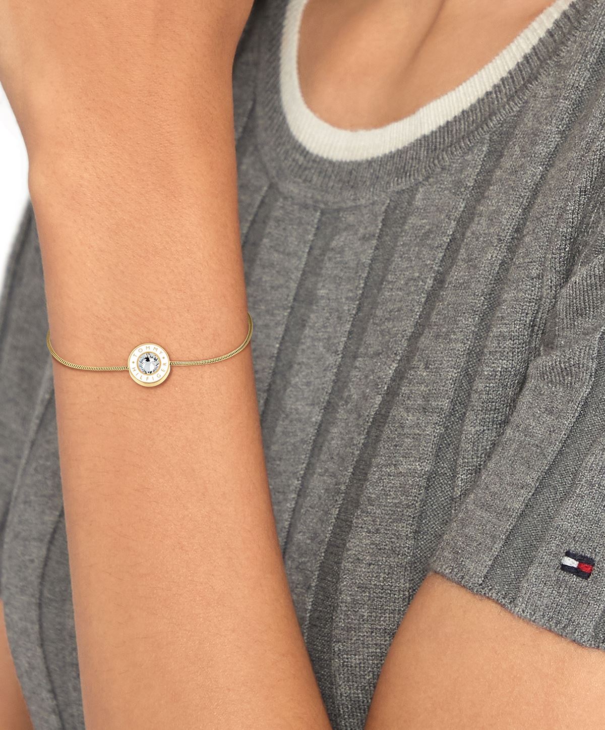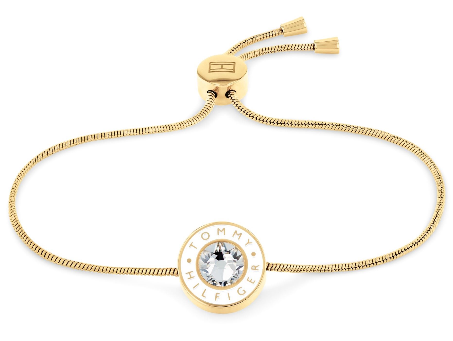 Moderní dámský náramek z dílny značky Tommy Hilfiger, vyrobený z vysoce kvalitní oceli, pozlacený oblíbeným žlutým zlatem, zdobený stylovou ozdobou s bílým smaltem a zirkonem, maximální nastavitelná délka náramku: 23 cm, posuvné zapínání díky kterému si upravíte délku podle potřeby.