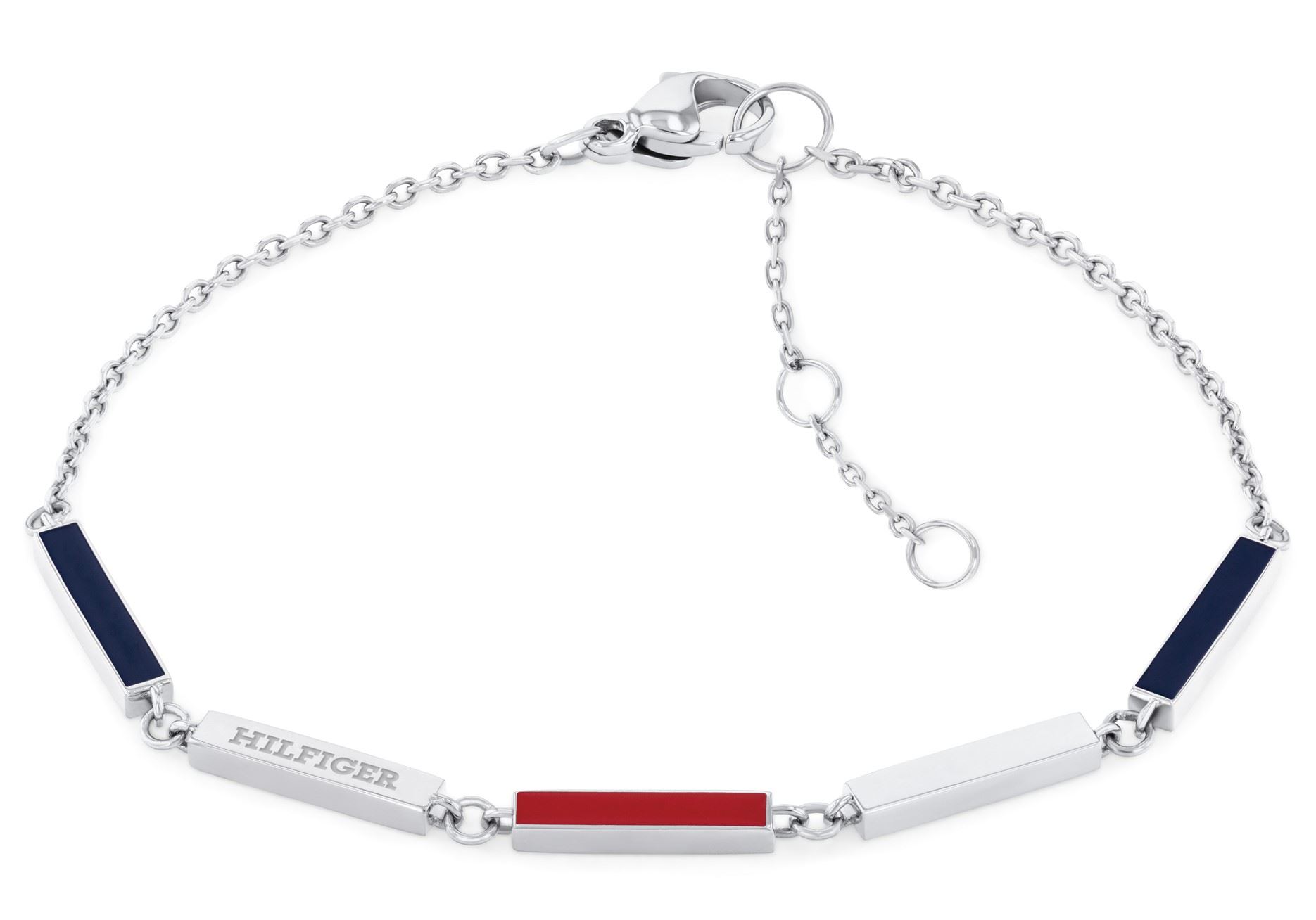 Slušivý náramek pro ženy od značky Tommy Hilfiger, vyrobený z kvalitní chirurgické oceli, tolik známý a oblíbený trilocor design upravený červeným a modrým smaltem, délka náramku: 18 cm, s možností prodloužení až 5 cm, zapínání na karabinku.