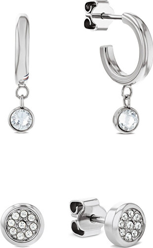 Tommy Hilfiger 2780975 je dámský dárkový set náušnic, který obsahuje dva páry - kruhy s pohyblivým přívěskem s krystalem a pecky s kulatými krystaly. Šperky jsou vyrobené z chirurgické oceli ve stříbrném odstínu a mají pohodlné zapínání na nasouvací puzetu. Rozměrově jde o jemný doplněk s průměrem 0,5 cm a délkou 1,9 cm, takže je snadno sladíte do práce i na večer.