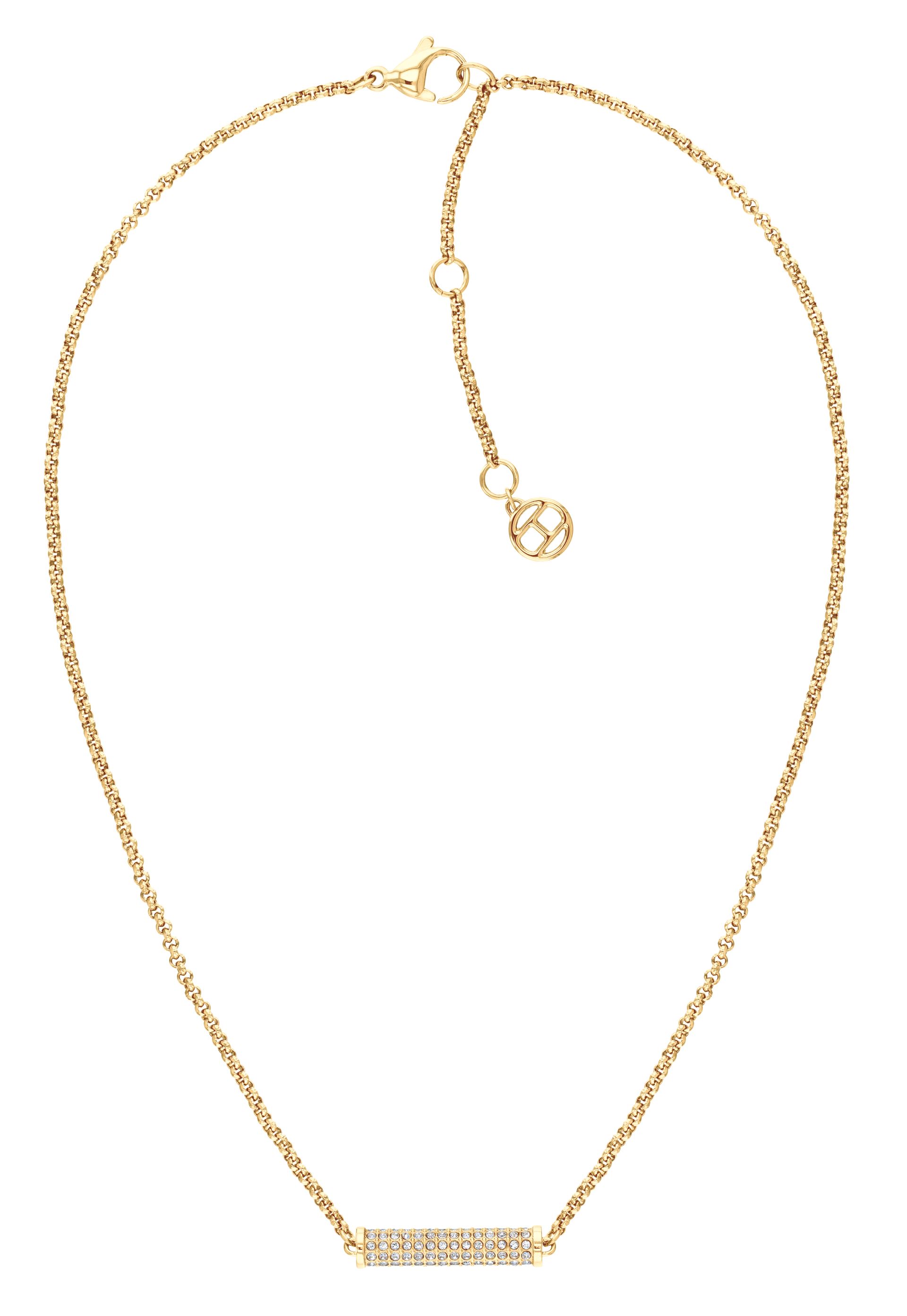 Moderní dámský náhrdelník z dílny značky Tommy Hilfiger, vyrobený z kvalitní pozlacené oceli ve žlutém odstínu a zdobený zirkony, zapínání formou oblíbené karabinky.